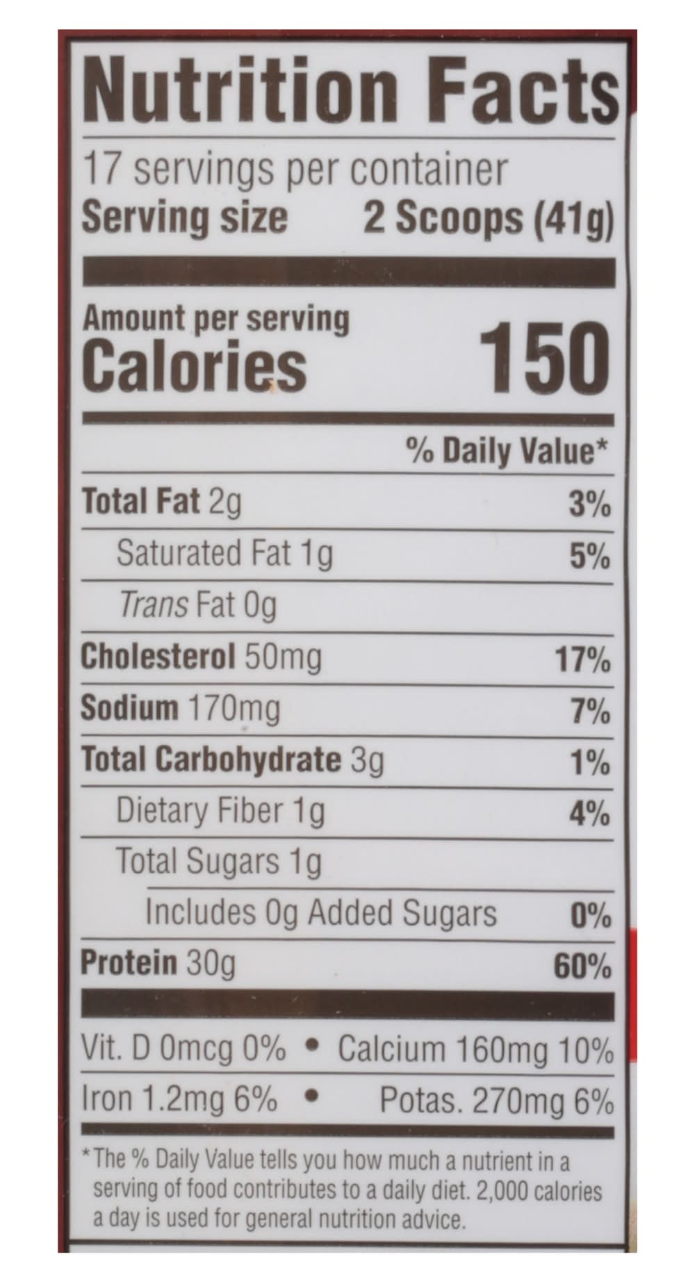 Ingredients: Whey Protein Isolate, Whey Protein Concentrate Cocoa Processed with Alkali, Contains 2% or Less of Soluble Corn Fiber, Sunflower Lecithin, Natural and Artificial Flavors, Acesulfame Potassium, Sucralose, Xanthan Gum, Salt. Contains: Milk, Corn