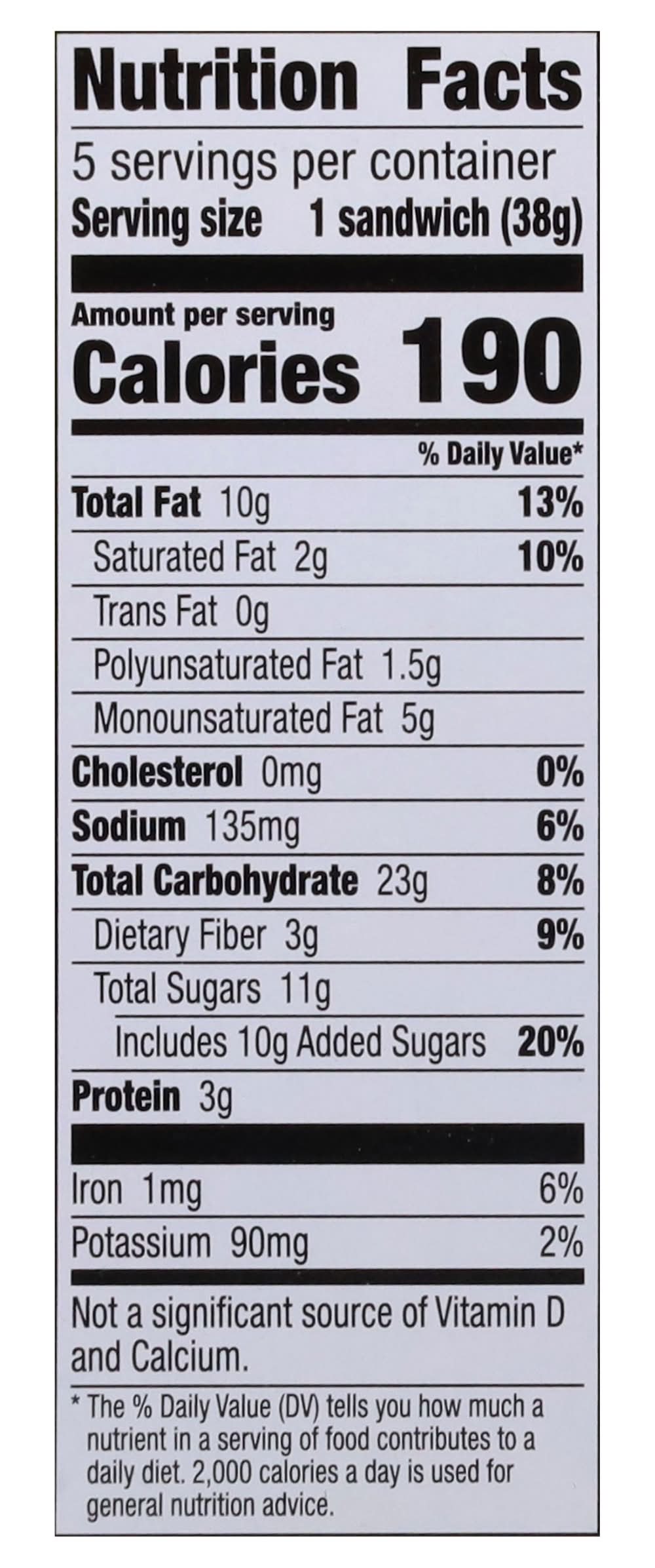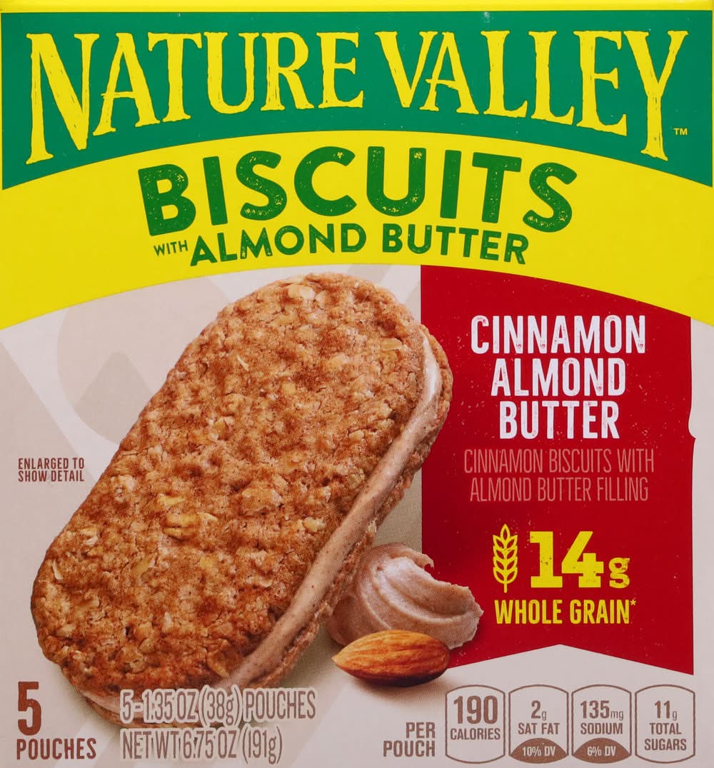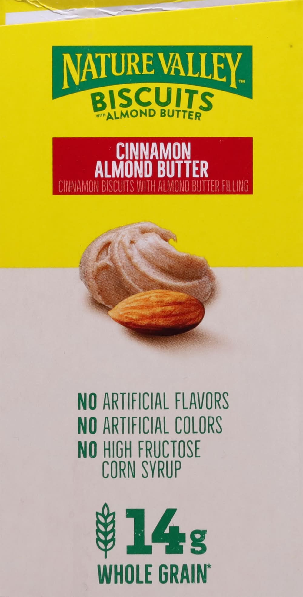 Cinnamon biscuits with almond butter filling Energy from 14 g of whole grain Per pouch: 190 calories, 2.5 g sat. fat, 150 mg sodium, 11 g sugars Each biscuit has a delicious crisp texture and 100% natural whole grain oats combined with the goodness of almond butter. With 14 g of whole grain per serving, they provide nutritious energy to help keep you going any time of the day. Good source of fiber (contains 10 g total fat per serving) 0 g trans fat No high fructose corn syrup No artificial Pack size: 5