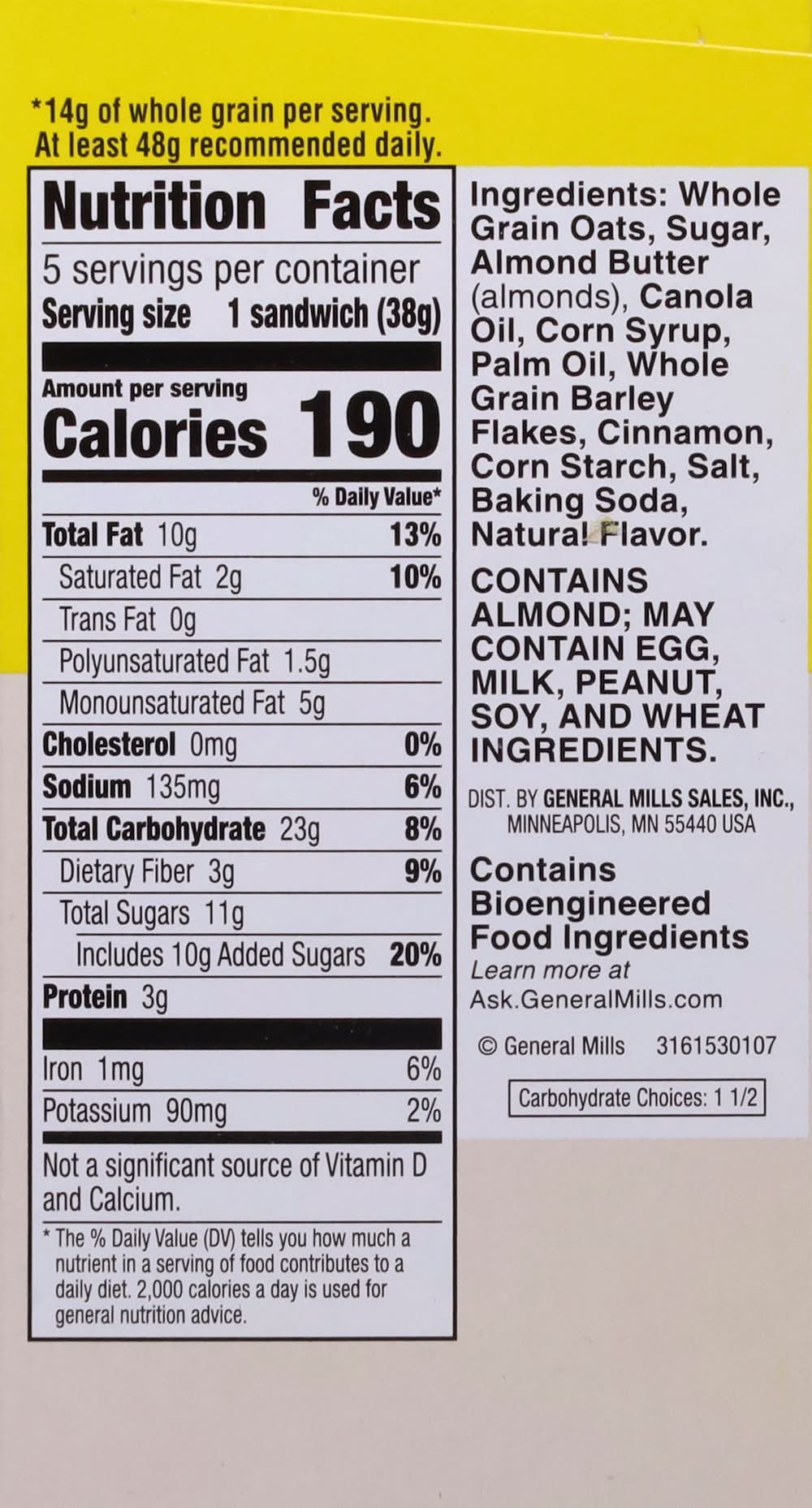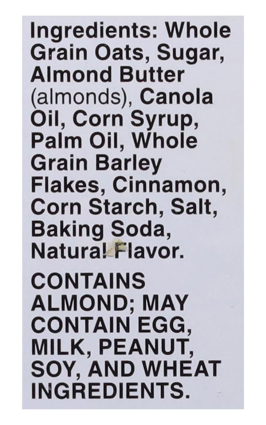 Ingredients: Whole Grain Oats, Sugar, Almond Butter (Almonds), Canola Oil, Corn Syrup, Palm Oil, Whole Grain Barley Flakes, Cinnamon, Corn Starch, Salt, Baking Soda, Natura! Flavor Contains: Corn, Tree Nuts, Almonds, Oat, Barley, Eggs, Milk, Peanuts, Soybeans, Wheat