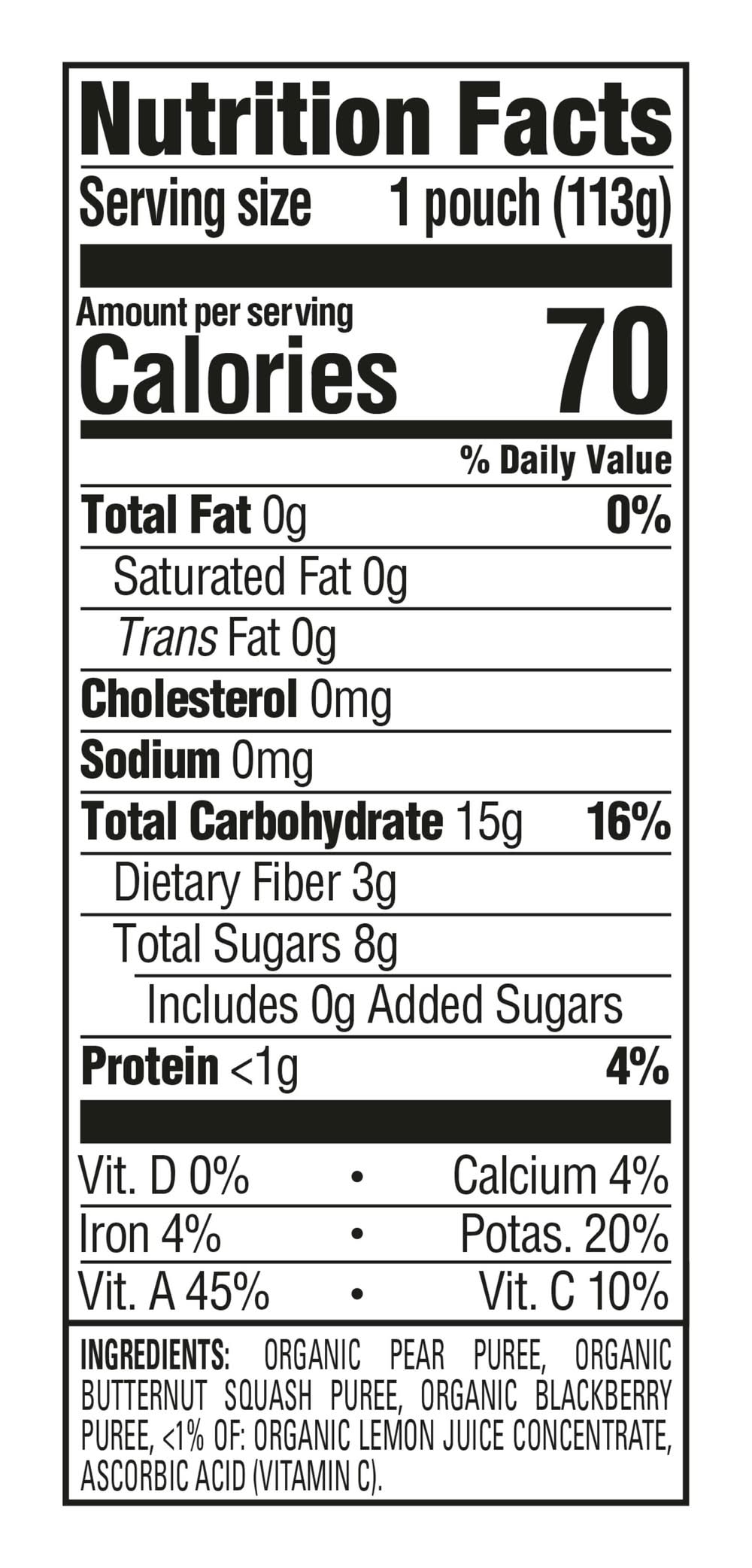 Ingredients: ORGANIC PEAR PUREE, ORGANIC BUTTERNUT SQUASH PUREE, ORGANIC BLACKBERRY, 1% OF: ORGANIC LEMON JUICE CONCENTRATE, ASCORBIC ACID (VITAMIN C), . Contains: Does Not Contain Any of the 8 Major Allergens