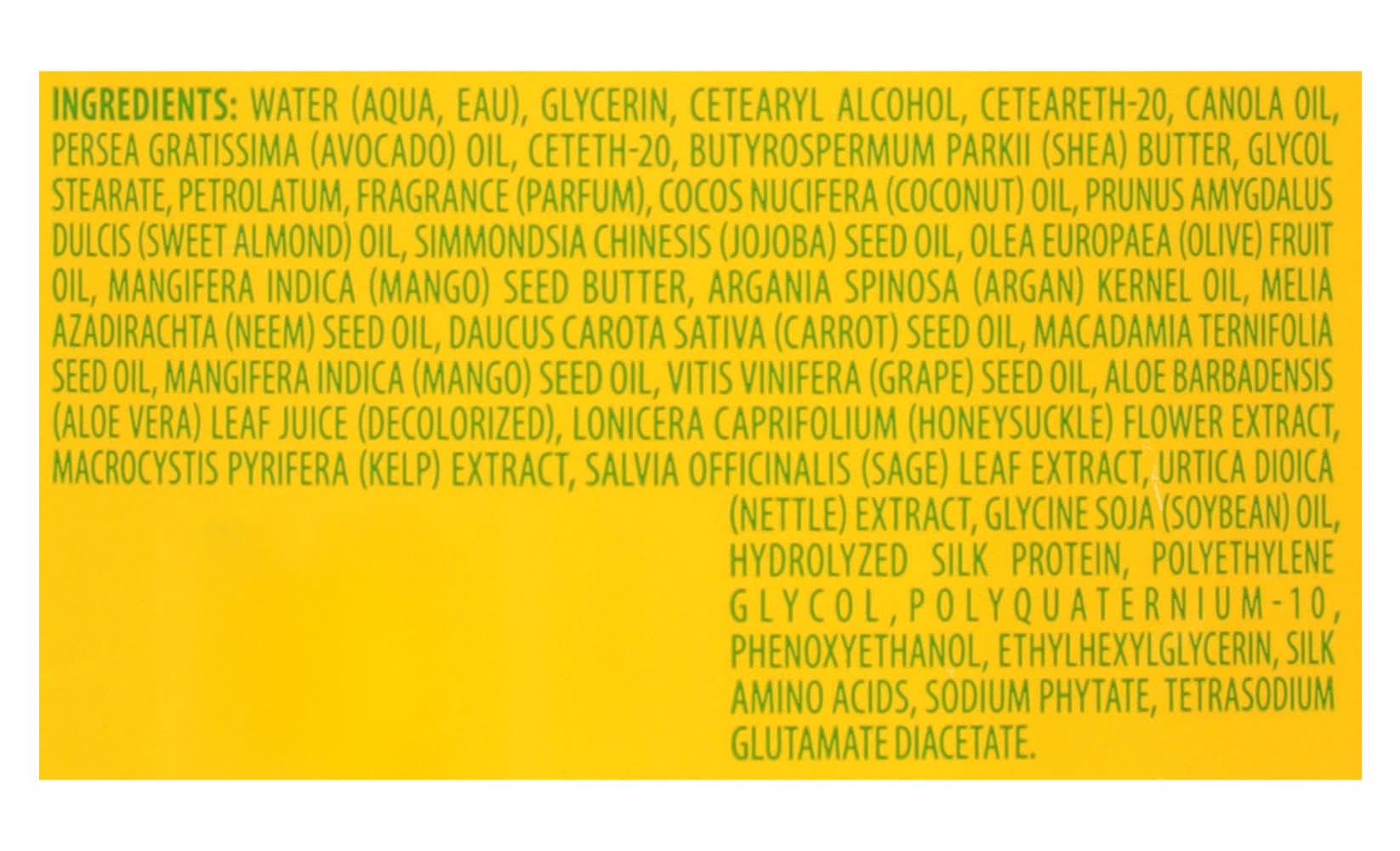 Ingredients: Water (Aqua, Eau), Glycerin, Cetearyl Alcohol, Ceteareth-20, Canola Oil, Persea Gratissima (Avocado) Oil, Ceteth-20, Butyrospermum Parkii (Shea) Butter, Glycol Stearate, Petrolatum, Fragrance (Parfum), Cocos Nucifera (Coconut) Oil, Prunus Amygdalus Dulcis (Sweet Almond) Oil, Simmondsia Chinesis (Jojoba) Seed Oil, Olea Europaea (Olive) Fruit Oil, Mangifera Indica (Mango) Seed Butter, Argania Spinosa (Argan) Kernel Oil, Melia Azadirachta (Neem) Seed Oil, Daucus Carota Sativa (Carrot) Seed Oil, Macadamia Ternifolia Seed Oil, Mangifera Indica (Mango) Seed Oil, Vitis Vinifera (Grape) Seed Oil, Aloe Barbadensis (Aloe Vera) Leaf Juice (Decolorized), Lonicera Caprifolium (Honeysuckle) Flower Extract, Macrocystis Pyrifera (Kelp) Extract, Salvia Officinalis (Sage) Leaf Extract, Urtica Dioica (Nettle) Extract, Glycine Soja (Soybean) Oil, Hydrolyzed Silk Protein, Polyethylene Glycol, Polyquaternium - 10, Phenoxyethanol, Ethylhexylglycerin, Silk Amino Acids, Sodium Phytate, Tetrasodium Glutamate Diacetate Contains: Tree Nuts, Sheanuts, Tree Nuts, Coconuts, Tree Nuts, Almonds, Tree Nuts, Argan Nuts, Tree Nuts, Macadamia Nuts, Soybeans