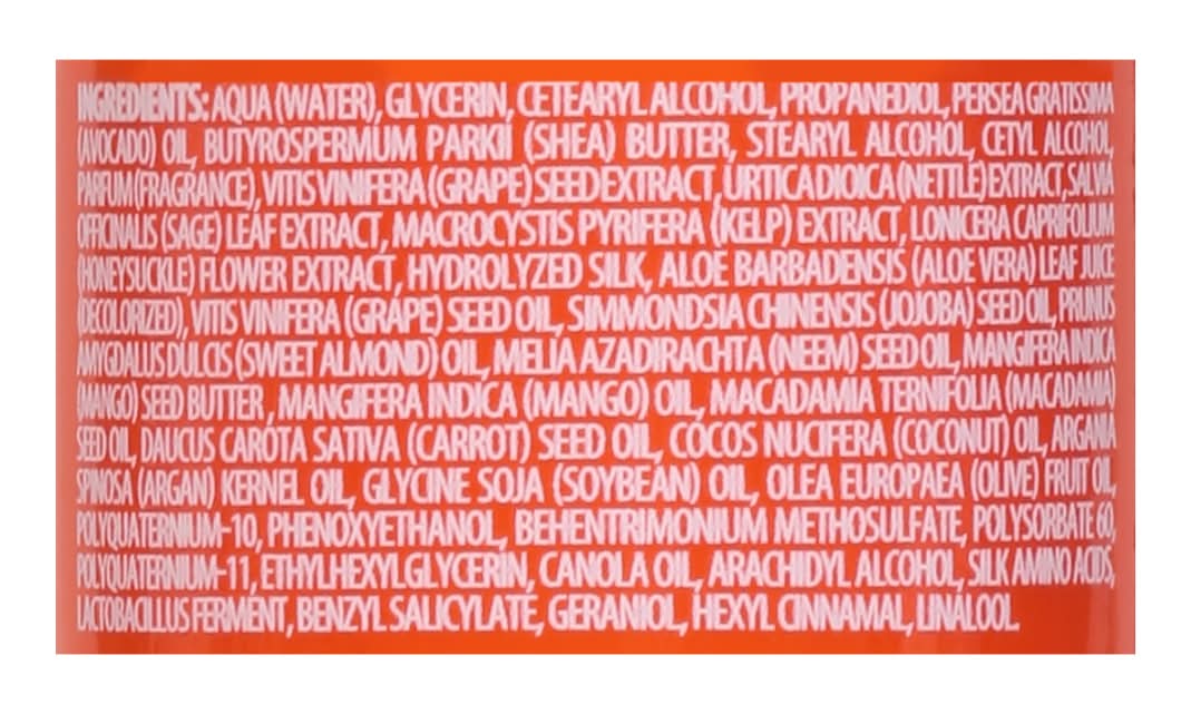 Ingredients: Aqua (Water), Glycerin, Cetearyl Alcohol, Propanediol, Persea Gratissima Avocado) Oil, Butyrospermum Parkii (Shea) Butter, Stearyl Alcohol, Cetyl Alcohol, Parfum (Fragrance), Vitis Vinifera (Grape) Seed Extract, Urticadioica (Nettle) Extract, Salva Officinalis (Sage) Leaf Extract, Macrocystis Pyrifera (Kelp) Extract, Lonicera Caprifolum (Honeysuckle) Flower Extract, Hydrolyzed Silk, Aloe Barbadensis (Aloe Vera) Leaf Juice (Decolorized), Vitis Vinifera (Grape) Seed Oil, Simmondsia Chinensis (Jojoba) Seed Oil, Prunus Amygdalus Dulcis (Sweet Almond) Oil, Melia Azadirachta (Neem) Seed Oil, Mangiferaindica (Mango) Seed Butter, Mangifera Indica (Mango) Oil, Macadamia Ternifolia (Macadamia) Seed Oil, Daucus Carota Sativa (Carrot) Seed Oil, Cocos Nucifera (Coconut) Oil, Argana Spinosa (Argan) Kernel Oil, Glycine Soja (Soybean) Oil, Olea Europaea (Olive) Fruit Oil, Polyquaternium-10, Phenoxyethanol, Behentrimonium Methosulfate, Polysorbate 60, Polyquaternium-11, Ethylhexylglycerin, Canola Oil, Arachidyl Alcohol, Silk Amino Acids, Lactobacillus Ferment, Benzyl Salicylate, Geraniol, Hexyl Cinnamal, Linalool Contains: Tree Nuts, Sheanuts, Tree Nuts, Almonds, Tree Nuts, Macadamia Nuts, Tree Nuts, Coconuts, Tree Nuts, Argan Nuts, Soybeans