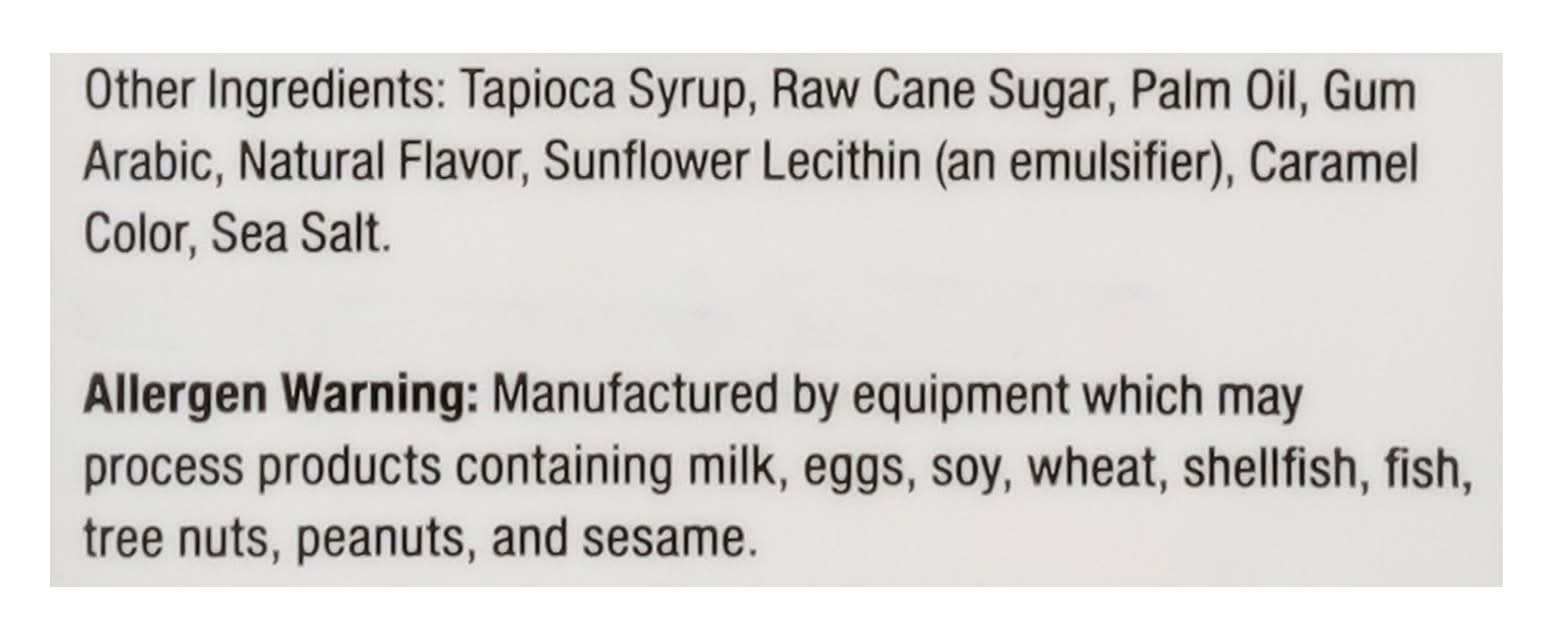 Ingredients: Other Ingredients: Tapioca Syrup, Raw Cane Sugar, Palm Oil, Gum Arabic, Natural Flavor, Sunflower Lecithin (an Emulsifier), Caramel Color, Sea Salt Contains: Milk, Eggs, Soybeans, Wheat, Crustacean Shellfish, Molluscan Shellfish, Fish, Tree Nuts, Peanuts, Sesame