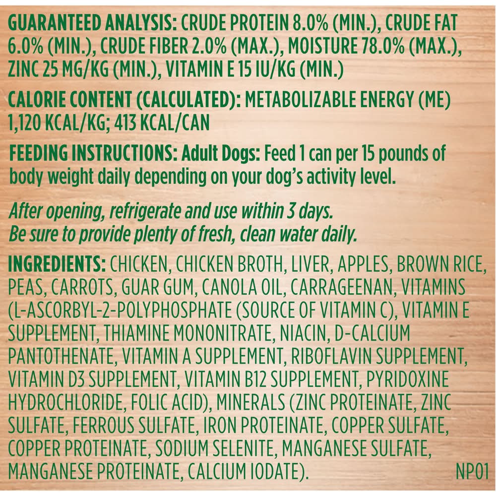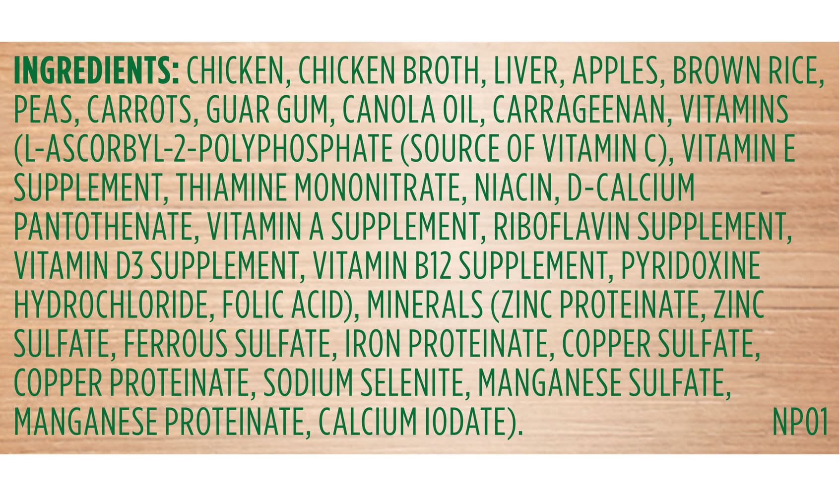 Ingredients: Chicken, Chicken Broth, Liver, Apples, Brown Rice, Peas, Carrots, Guar Gum, Canola Oil, Carrageenan, Vitamins (L-Ascorbyl-2-Polyphosphate (Source Of Vitamin C), Vitamin E Supplement, Thiamine Mononitrate, Niacin, D-Calcium Pantothenate, Vitamin A Supplement, Riboflavin Supplement, Vitamin D3 Supplement, Vitamin B12 Supplement, Pyridoxine Hydrochloride, Folic Acid), Minerals (Zinc Proteinate, Zinc Sulfate, Ferrous Sulfate, Iron Proteinate, Copper Sulfate, Copper Proteinate, Sodium Selenite, Manganese Sulfate, Manganese Proteinate, Calcium Iodate)