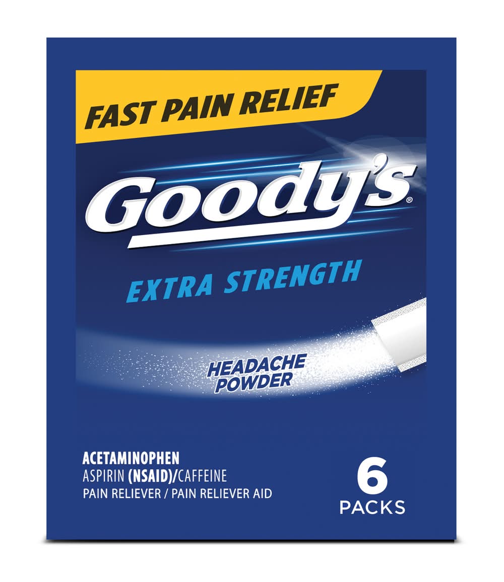 Goody's Extra Strength Headache Powders provide fast pain relief by combining the active ingredients acetaminophen, aspirin (a nonsteroidal anti-inflammatory drug), and caffeine. The product is conveniently packaged in on-the-go stick packs, designed for easy transportation and usage whenever needed. Each pack contains six powder sticks.