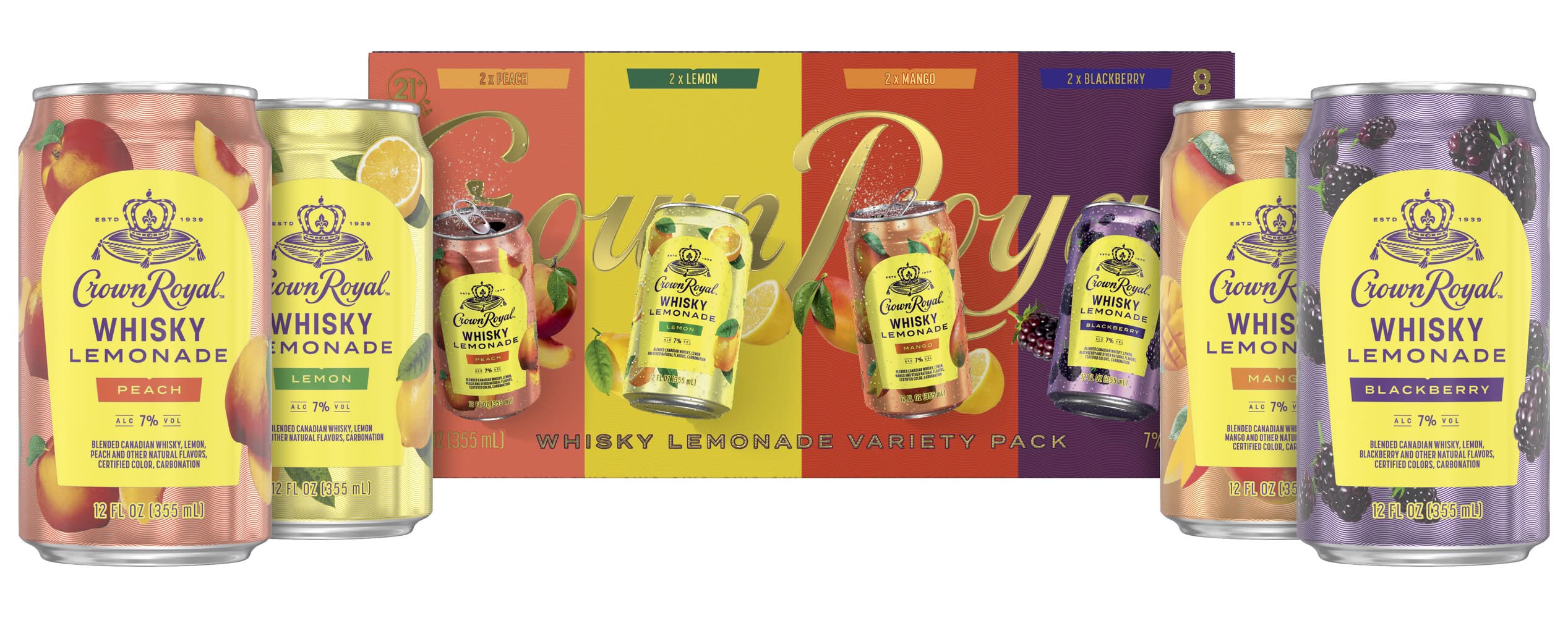 Enjoy a royally delicious cocktail in a ready-to-drink can with Crown Royal Whisky Cocktail Variety Pack. This mixed pack is a great way to find your favorite flavor and taste the convenient luxury that Crown Royal cocktails have to offer. Try a variety of canned mixed drink flavors including Peach Tea, Whisky and Cola, Washington Apple, and Whisky Lemonade. Each flavor is crafted with the signature smoothness of Crown Royal combined with delicious flavors like fresh peaches, crisp cola, green apples, or zesty lemonade. For a refreshing-tasting cocktail, simply pour in a glass with ice. Crown Royal Washington Apple won a Double Gold medal and Crown Royal Whisky and Cola and Peach Tea won Gold medals at the 2021 San Francisco World Spirits Competition. 12 fl oz cans, two of each Crown Royal Whisky Cocktail flavors: Washington Apple, Peach Tea, Whisky and Cola, and Whisky Lemonade. • Flavor: Assorted • Pack size: 8 • Alcohol by volume: 7%