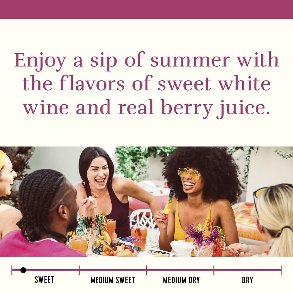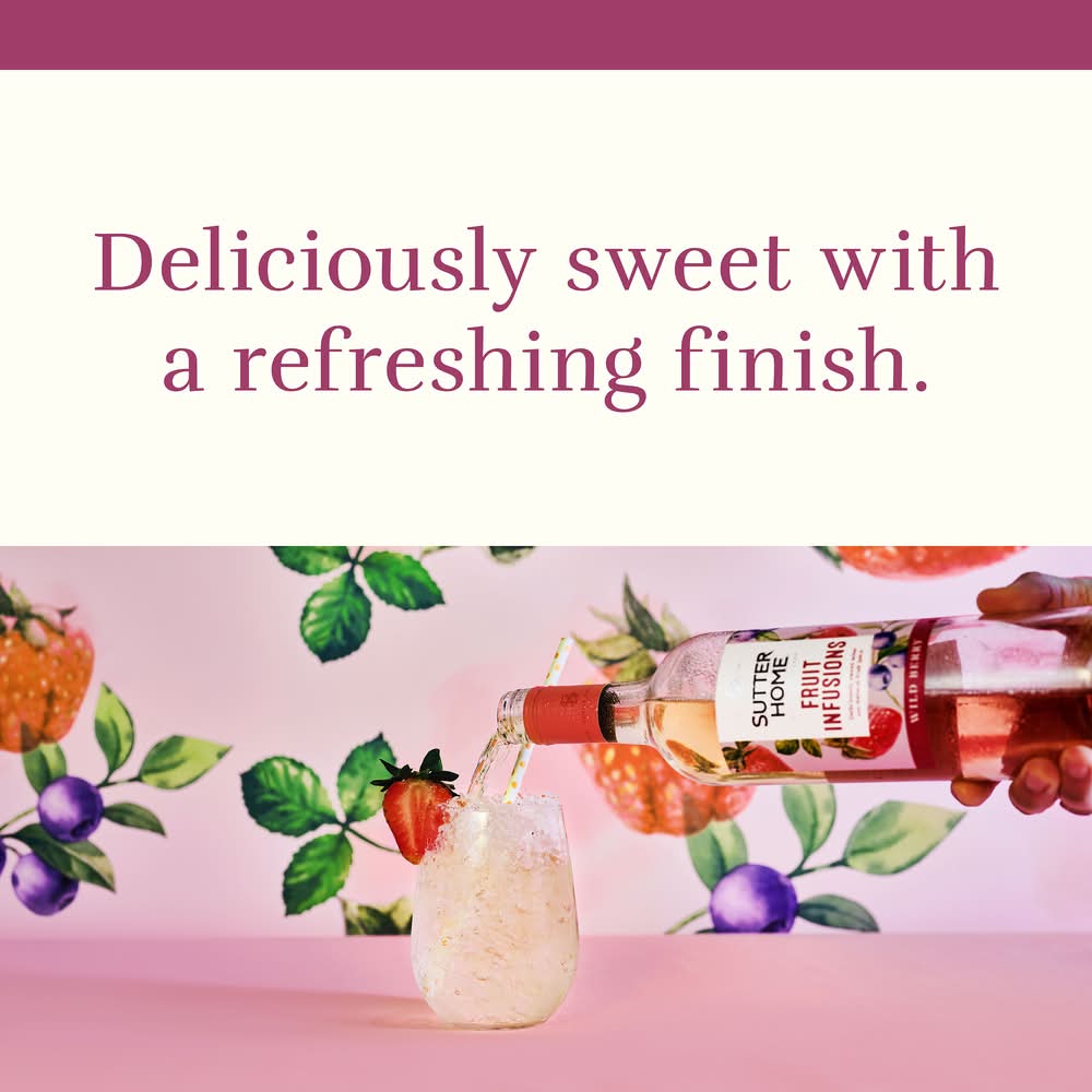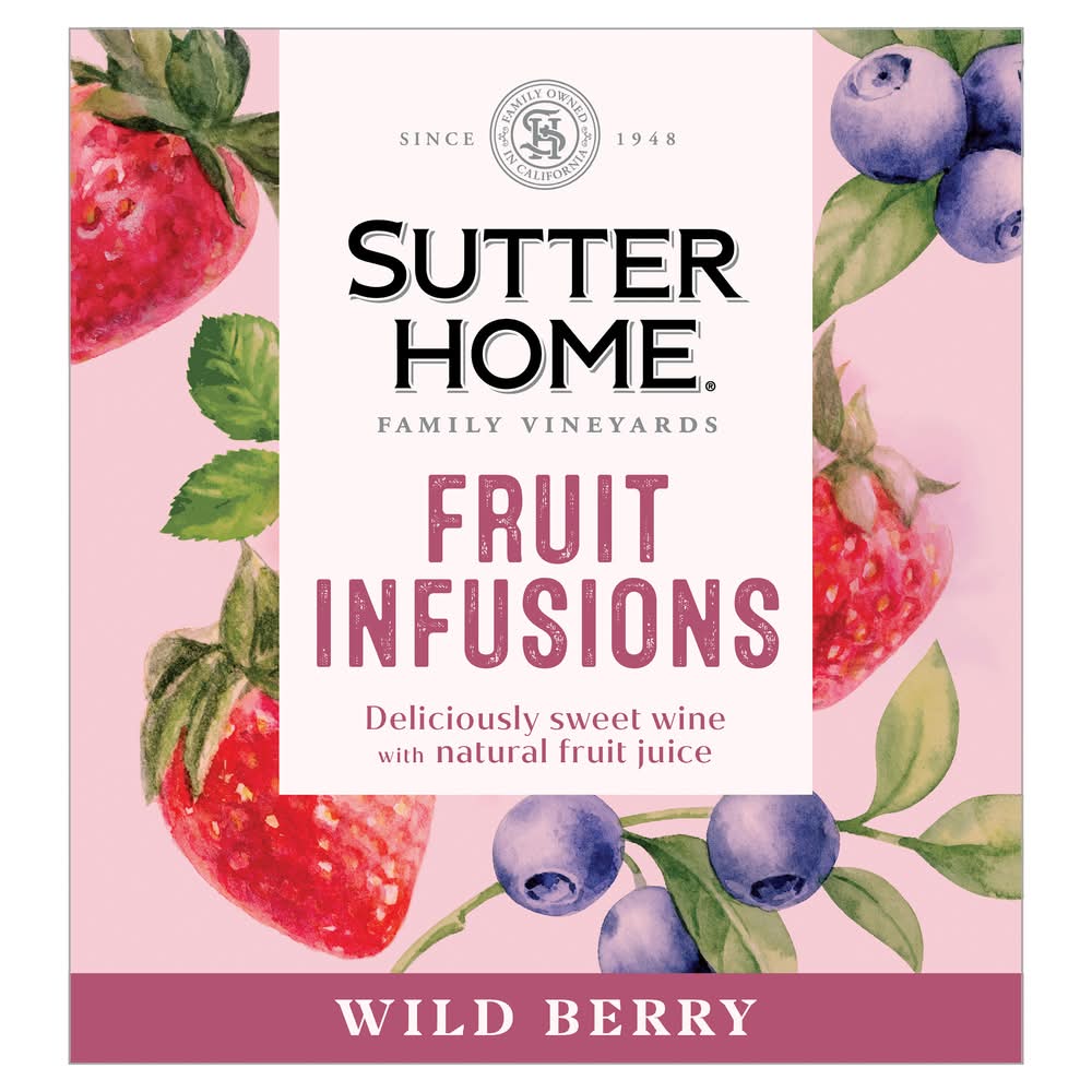 Sutter Home Fruit Infusions Wild Berry White Wine is bursting with flavors of fresh-picked strawberries and ripe blueberries. This white wine is deliciously sweet with natural berry juice, a refreshing finish and a hint of spritz. Sutter Home Fruit Infusions Wild Berry earned 84 points from 2021 Beverage Testing Institute and 88 points - Silver from 2022 California State Fair. A perfect pairing with chocolate desserts and summer berry salads, this fruit wine is a delicious choice for packing in picnic baskets or sipping on warm summer evenings. Sutter Home berry white wine is made using real fruit juice, natural flavors, and grapes sourced from California vineyards. This bottled wine has 7.5% alcohol by volume and features a screw cap for easy opening—no corkscrew required. This berry white wine is also available in mini wine bottles for portability. Sutter Home, family owned since 1948, is the brand generations of wine lovers trust to deliver consistent, award-winning quality and value for every wine occasion. • Brand: Sutter home • Category: Fruit wine • Alcohol by volume: 7.5% • Tasting notes: berry