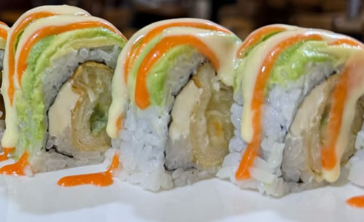 Tempura Veggie Spring Rolls, Cream Cheese topped w. Avocado, Spicy Mayo, Mango Sauce