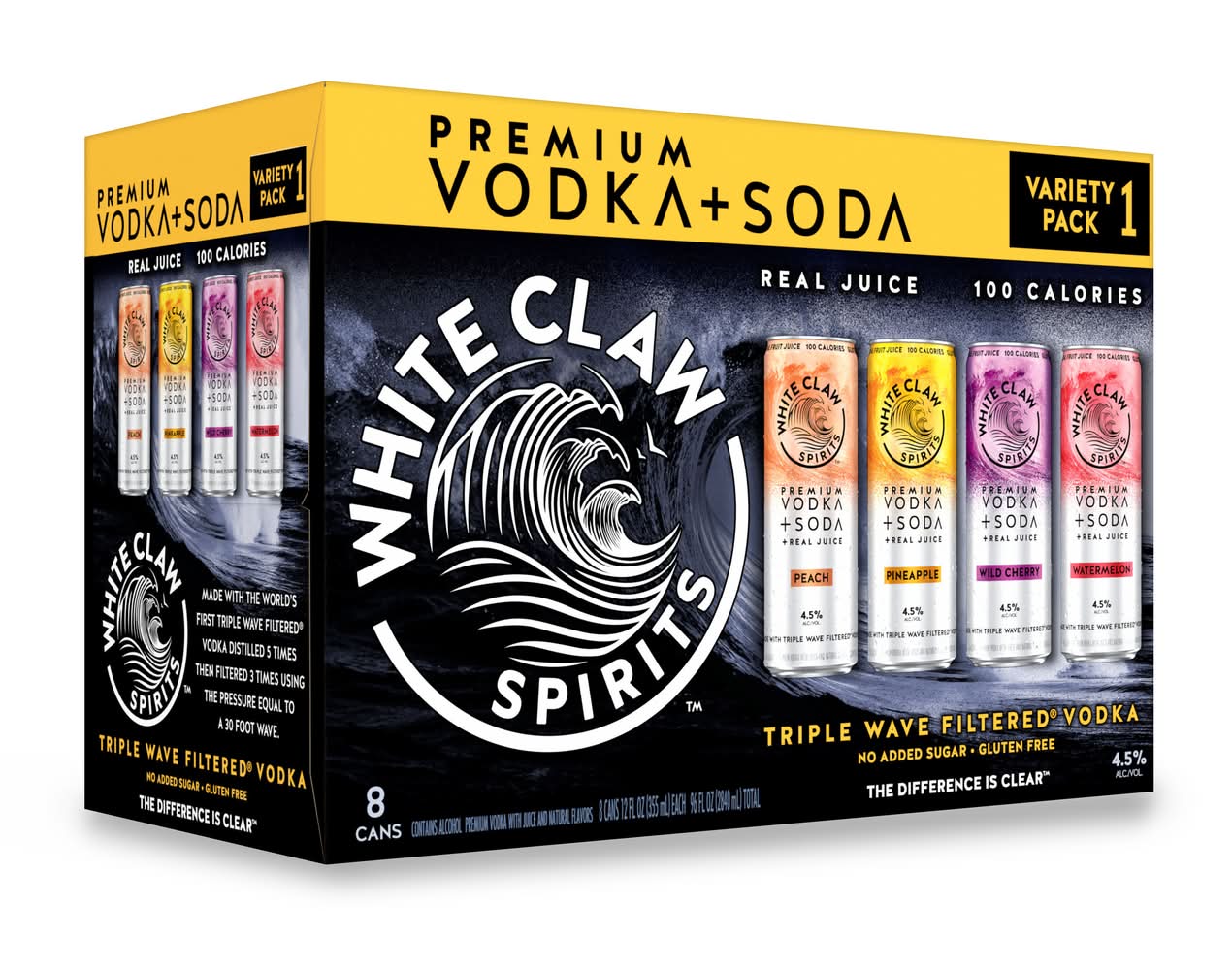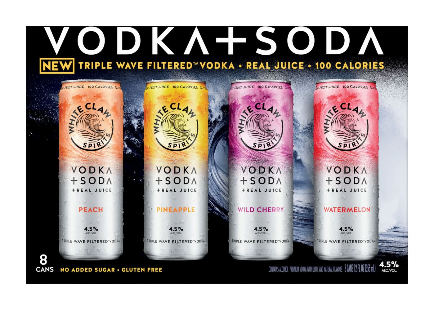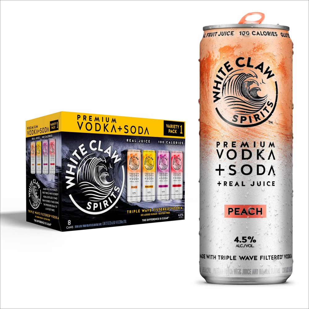 White Claw Triple Wave Filtered Premium Vodka + Soda + Real Juice Variety pack, Peach-Pineapple-Wild Cherry-Watermelon (8 x 12 fl oz)