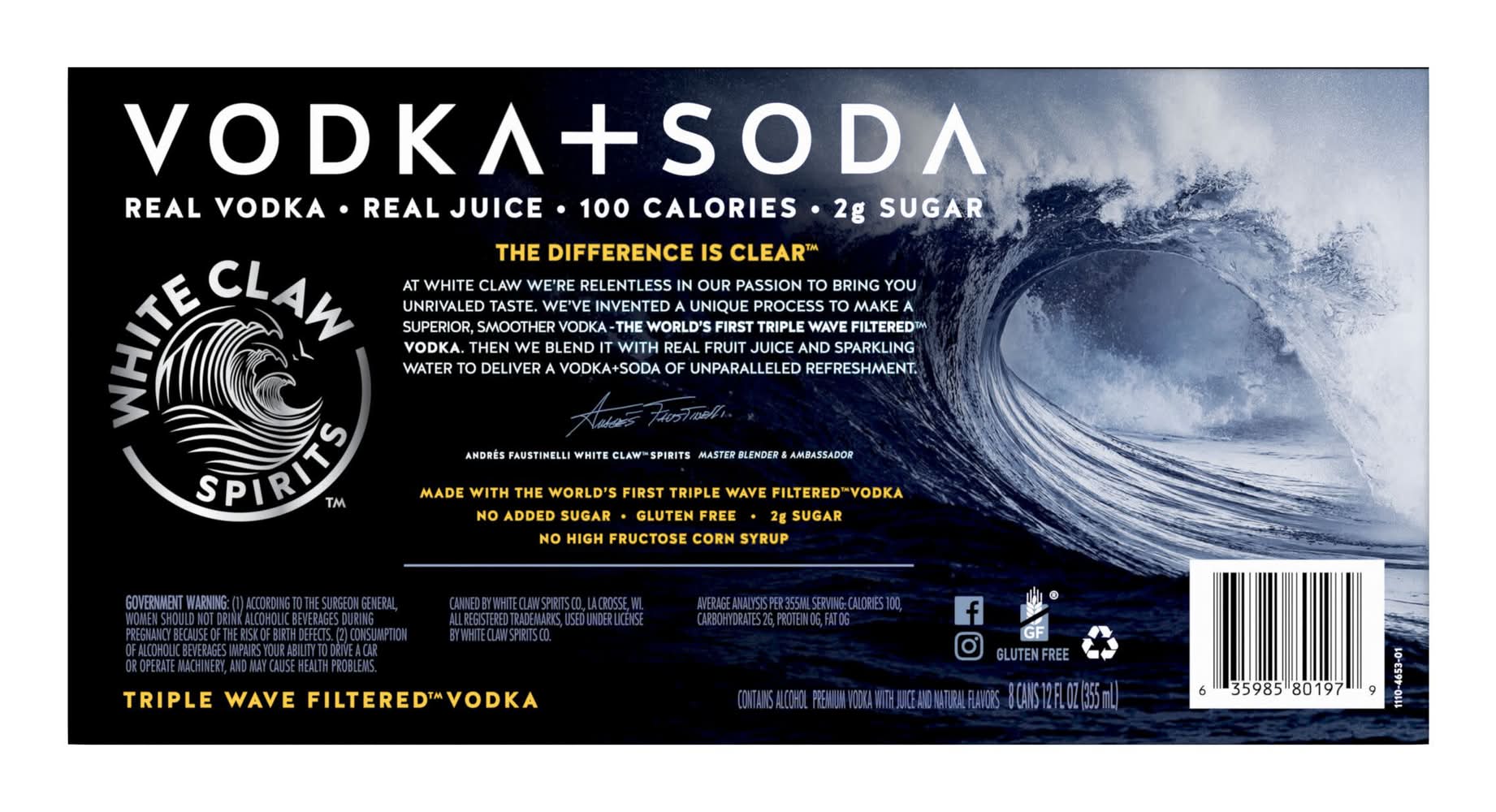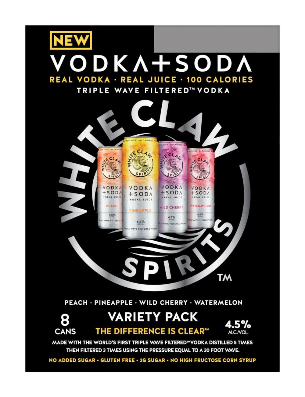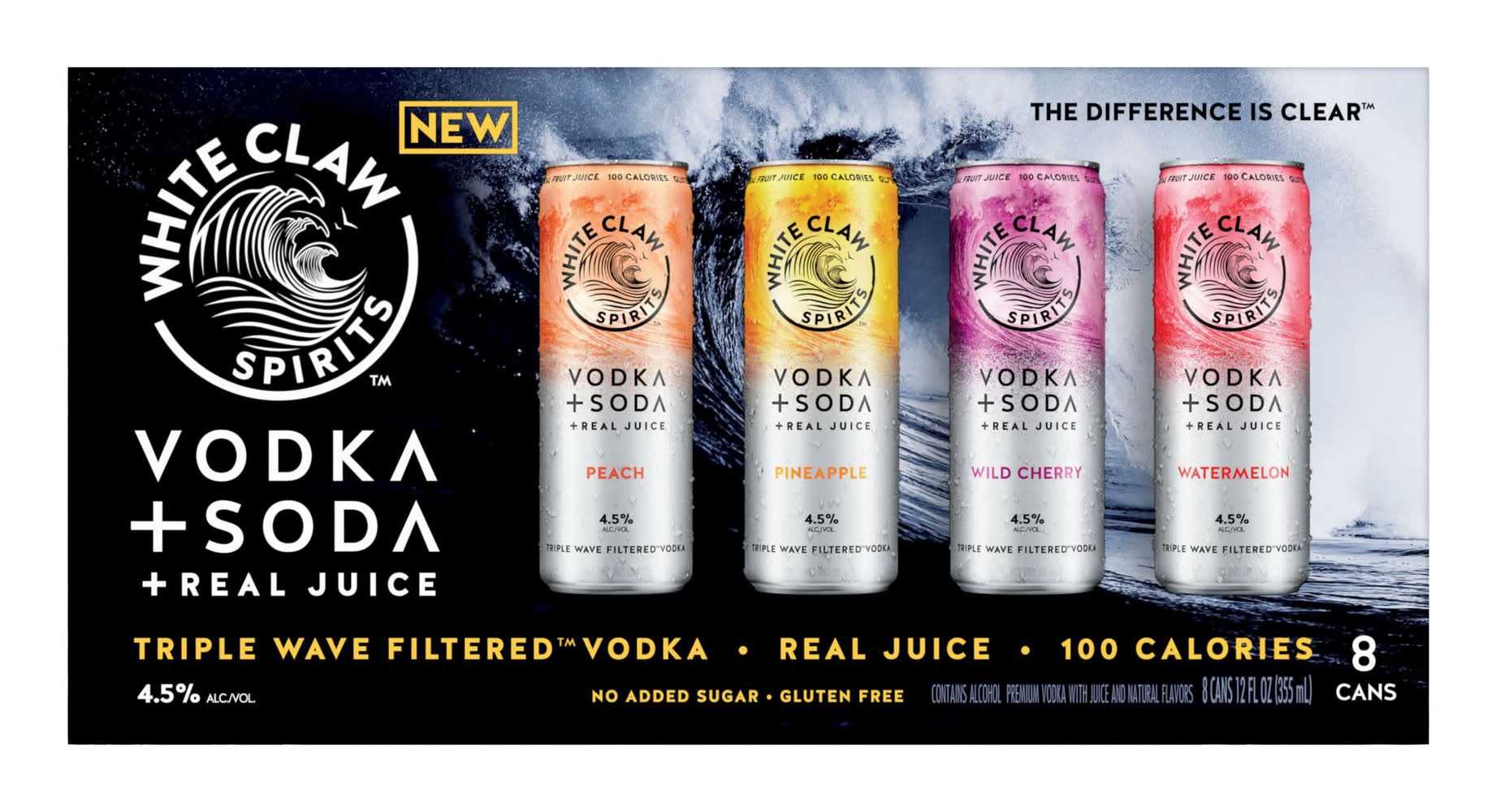 White Claw Triple Wave Filtered Premium Vodka + Soda + Real Juice Variety pack, Peach-Pineapple-Wild Cherry-Watermelon (8 x 12 fl oz)