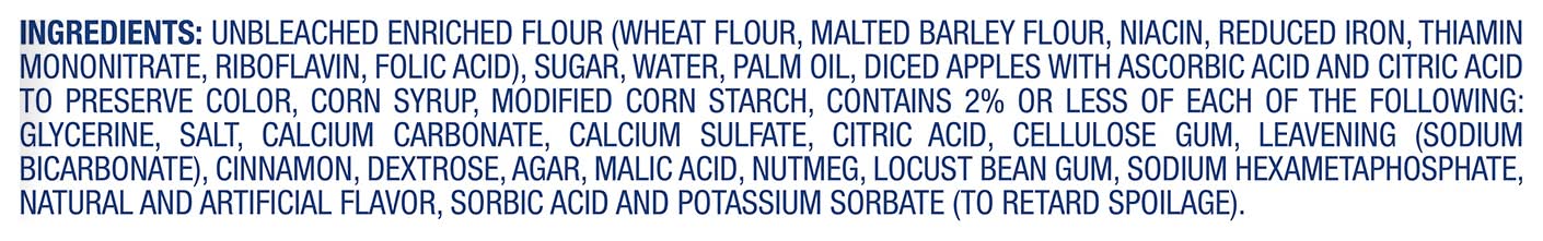 Ingredients: Unbleached Enriched Flour (Wheat Flour, Malted Barley Flour, Niacin, Reduced Iron, Thiamin Mononitrate, Riboflavin, Folic Acid), Sugar, Water, Palm Oil, Diced Apples with Ascorbic Acid and Citric Acid to Preserve Color, Corn Syrup, Modified Corn Starch, Contains 2% or Less of Each of the Following: Glycerine, Salt, Calcium Carbonate, Calcium Sulfate, Citric Acid, Cellulose Gum, Leavening (Sodium Bicarbonate), Cinnamon, Dextrose, Agar, Malic Acid, Nutmeg, Locust Bean Gum, Sodium Hexametaphosphate, Natural and Artificial Flavor, Sorbic Acid and Potassium Sorbate (to Retard Spoilage) Contains: Wheat, Barley