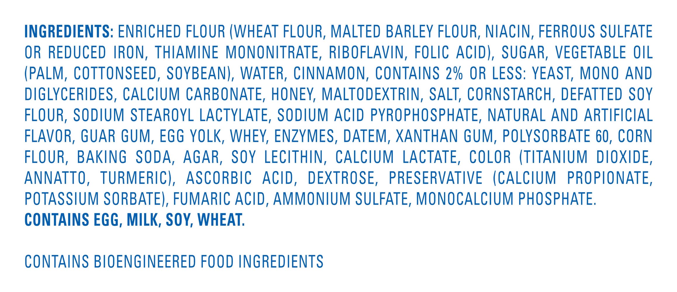 Ingredients: Enriched Flour (Wheat Flour, Malted Barley Flour, Niacin, Ferrous Sulfate Or Reduced Iron, Thiamine Mononitrate, Riboflavin, Folic Acid), Sugar, Water, Vegetable Oil (Palm, Cottonseed, Soybean), Cinnamon, Contains 2% Or Less: Yeast, Mono And Diglycerides, Calcium Carbonate, Honey, Maltodextrin, Salt, Cornstarch, Defatted Soy Flour, Sodium Stearoyl Lactylate, Sodium Acid Pyrophosphate, Natural And Artificial Flavor, Polysorbate 60, Corn Flour, Baking Soda, Egg Yolk, Whey, Enzymes, Datem, Guar Gum, Xanthan Gum, Soy Lecithin, Color (Annatto, Turmeric, Titanium Dioxide), Ascorbic Acid, Preservative (Calcium Propionate, Potassium Sorbate), Fumaric Acid, Ammonium Sulfate, Monocalcium Phosphate. Contains Egg, Milk, Soy, Wheat. Contains Bioengineered Food Ingredients Contains: Phosphate. Contains Egg, Milk, Soy, Wheat. Contains Bioengineered Food Ingredients.