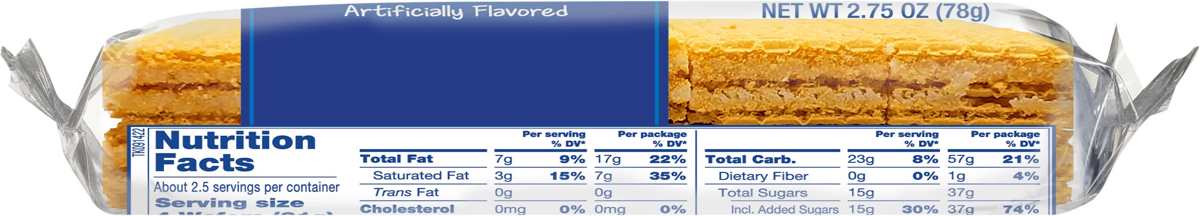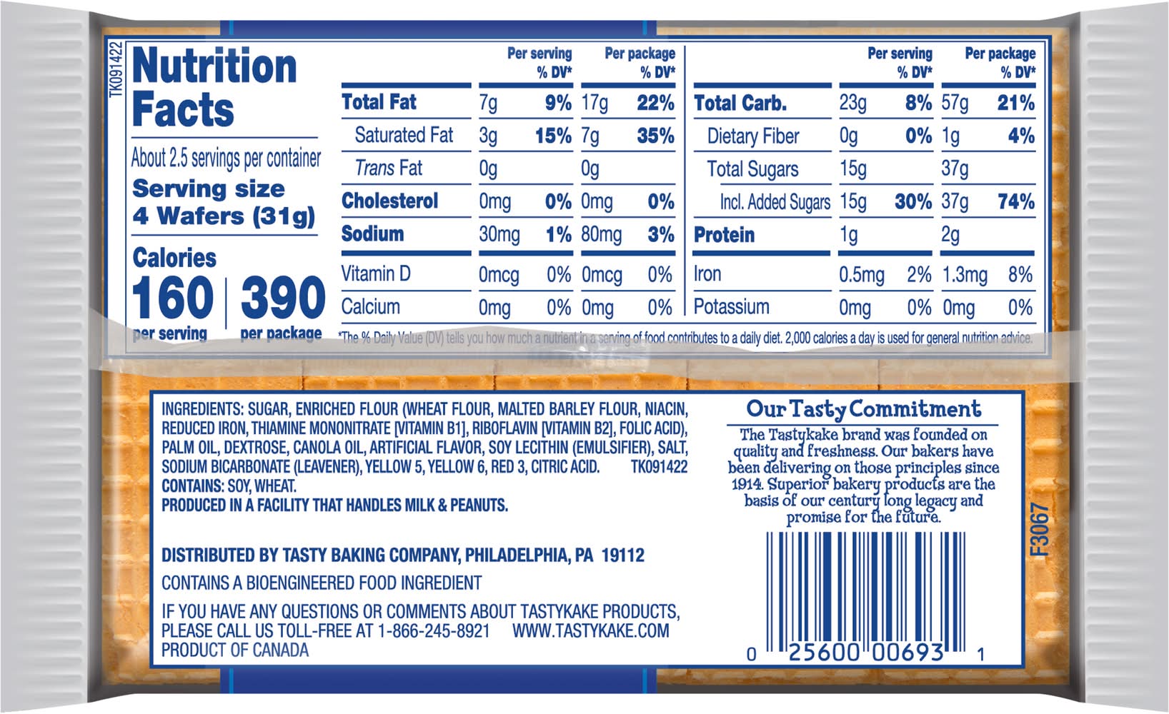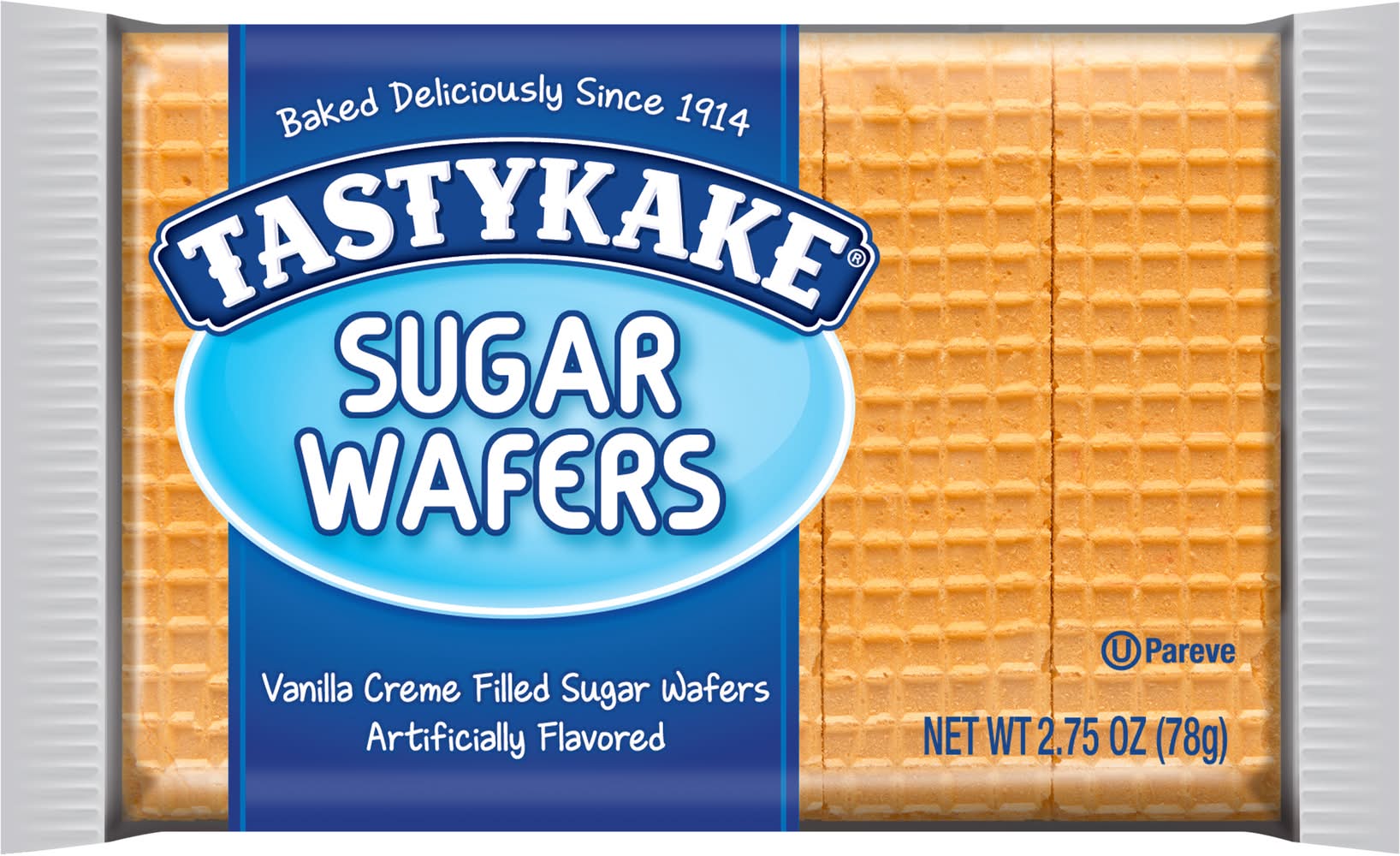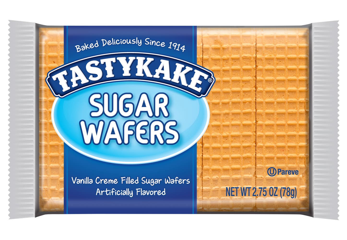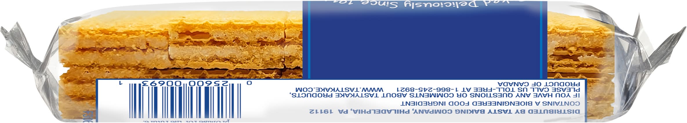 Vanilla creme filled sugar wafers. Artificially flavored. Contains a bioengineered food ingredient. Baked deliciously since 1914. Our Tasty Commitment: The Tastykake brand was founded on quality and freshness. Our bakers have been delivering on those principles since 1914. Superior bakery products are the basis of our century long legacy and promise for the future. Any other snack is a miskake. Creme filled sugar wafers. Light and airy snack. Accept no substitutes. 10 count. Satisfying snack-lovers of all ages for more than 100 years. • Brand: Tastykake • Flavor: Vanilla • kosher • Tasty Baking Company, Philadelphia, PA, 19112