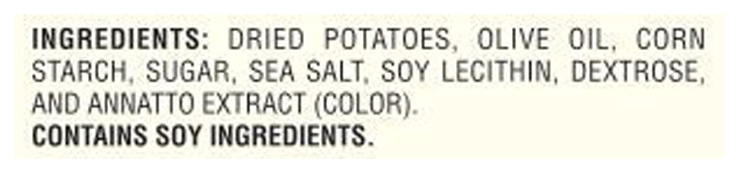 Ingredients: Dried Potatoes, Olive Oil, Corn Starch, Sugar, Sea Salt, Soy Lecithin, Dextrose, and Annatto Extract (Color) Contains: Soybeans