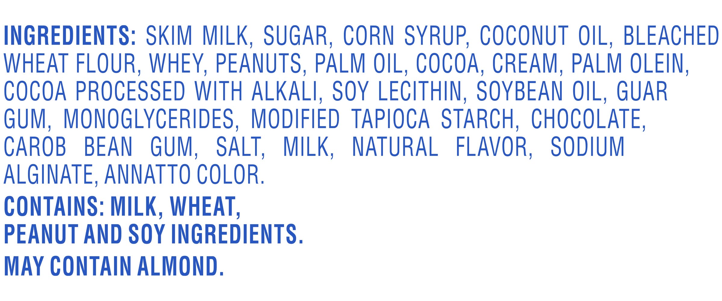 Ingredients: SKIM MILK, SUGAR, CORN SYRUP, COCONUT OIL, BLEACHED WHEAT FLOUR, WHEY, PEANUTS, PALM OLEIN, COCOA¹, CREAM, PALM OIL, COCOA PROCESSED WITH ALKALI¹, SOYBEAN OIL, SOY LECITHIN, GUAR GUM, MONOGLYCERIDES, MODIFIED TAPIOCA STARCH, CAROB BEAN GUM, SALT, CHOCOLATE¹, NATURAL FLAVOR, SODIUM ALGINATE, MILK, ANNATTO COLOR. Contains: MILK, WHEAT, PEANUT AND SOY INGREDIENTS. MAY CONTAIN TREE NUTS.