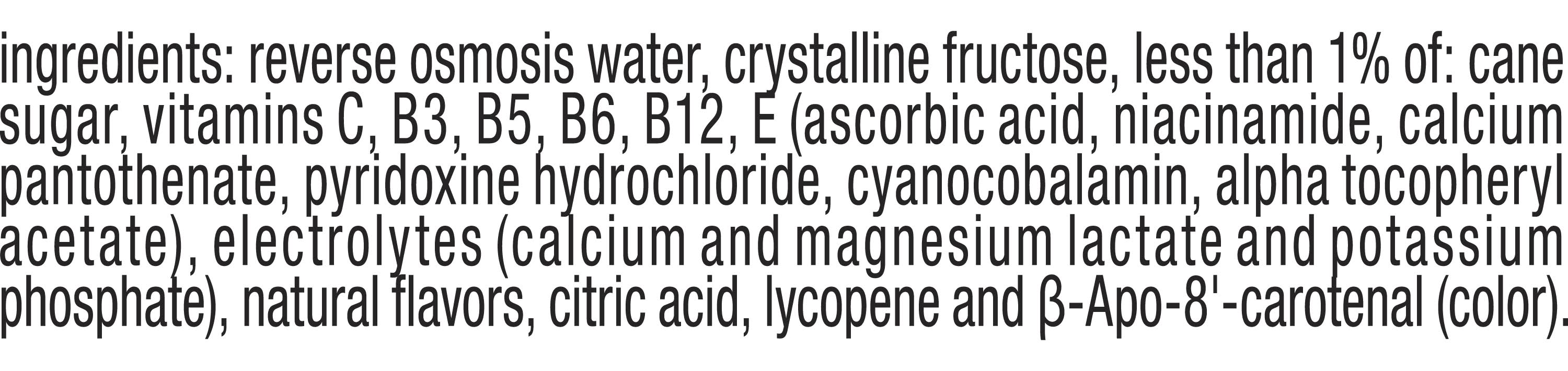 Ingredients: Reverse Osmosis Water, Crystalline Fructose, Less Than 0.5% Of: Vitamins C, E, B3, B5, B6, B12 (Ascorbic Acid, Alpha-Tocopheryl Acetate, Niacinamide, Calcium Pantothenate, Pyridoxine Hydrochloride, Cyanocobalamin), Electrolytes (Calcium And Magnesium Lactates And Potassium Phosphate And Sodium Citrate), Cane Sugar, Natural Flavors, Citric Acid, Lycopene And Beta-Apo-8'-Carotenal (For Color).
