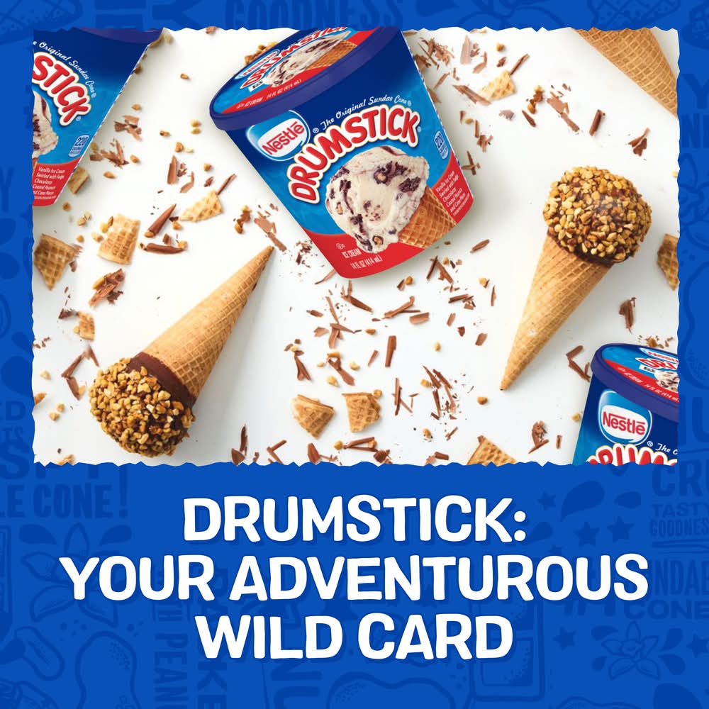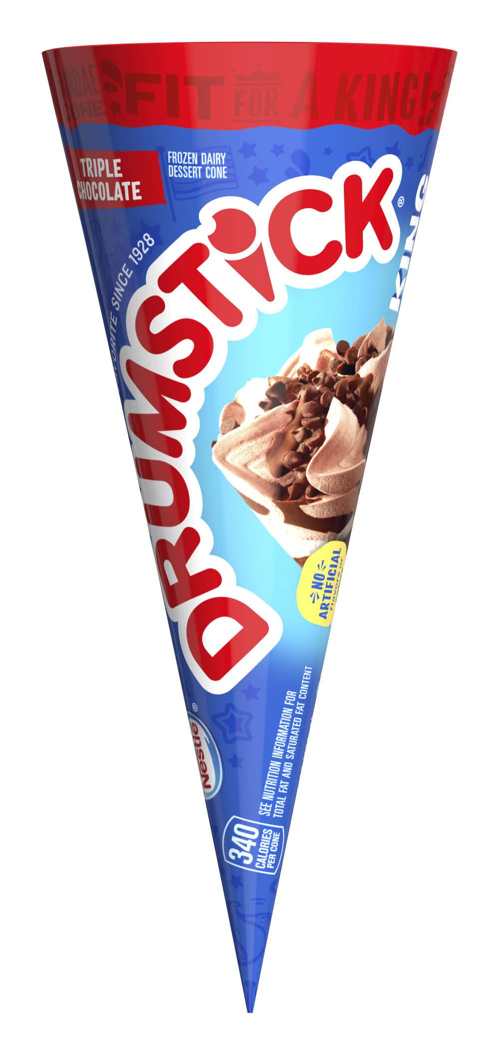 Drumstick Triple Chocolate King Size Sundae Cone is overflowing with creaminess, chocolativity and crunchability. This Drumstick cone features three layers of creamy chocolatey goodness in a crispy sugar cone, topped with fudge and chocolatey chips, and end with the unforgettable chocolatey nugget – creating a snacking experience like no other! This delicious frozen dessert is made with no artificial flavors or colors* for frozen treats perfect for the entire family. Each Triple Chocolate King Size Sundae Cone comes individually wrapped for quick and convenient snacking. Keep Drumstick cones frozen until ready to enjoy. Celebrate with The Original Sundae Cone and get the classic chocolate ice cream flavor you love all in one unique eating experience with Nestle Drumstick! (*Added colors from natural sources). • Brand: Drumstick • Flavor: Triple chocolate