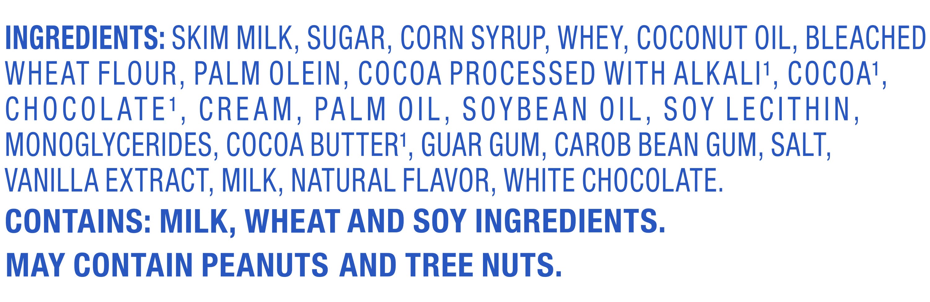 Ingredients: Skim Milk Sugar Corn Syrup Whey Coconut Oil Bleached Wheat Flour Cocoa Processed with Alkali Chocolate Cocoa Palm Oil Palm Olein Cream Soy Lecithin Soybean Oil Monoglycerides Guar Gum Cocoa Butter Carob Bean Gum Salt Milk Natural Flavor Vanilla Extract Contains: milk, wheat, soy, peanuts