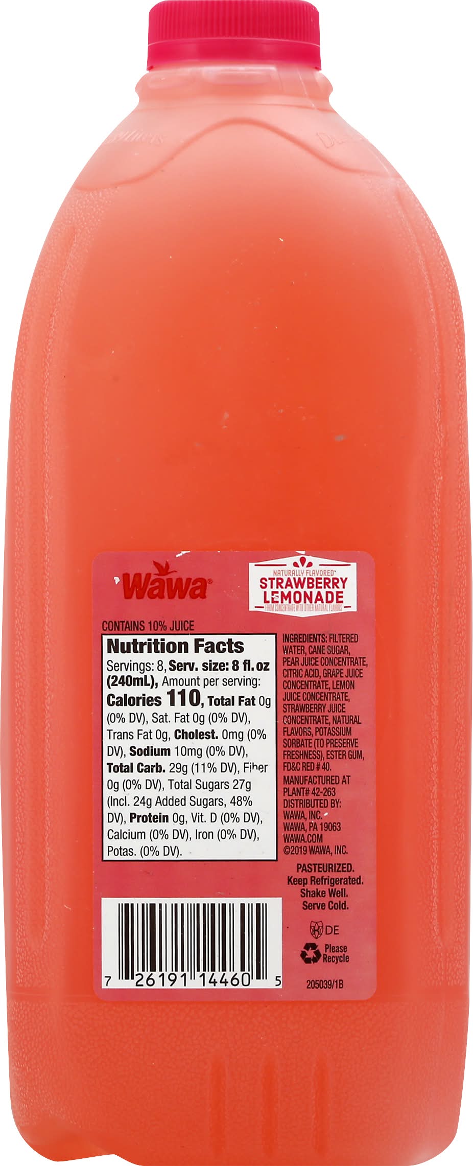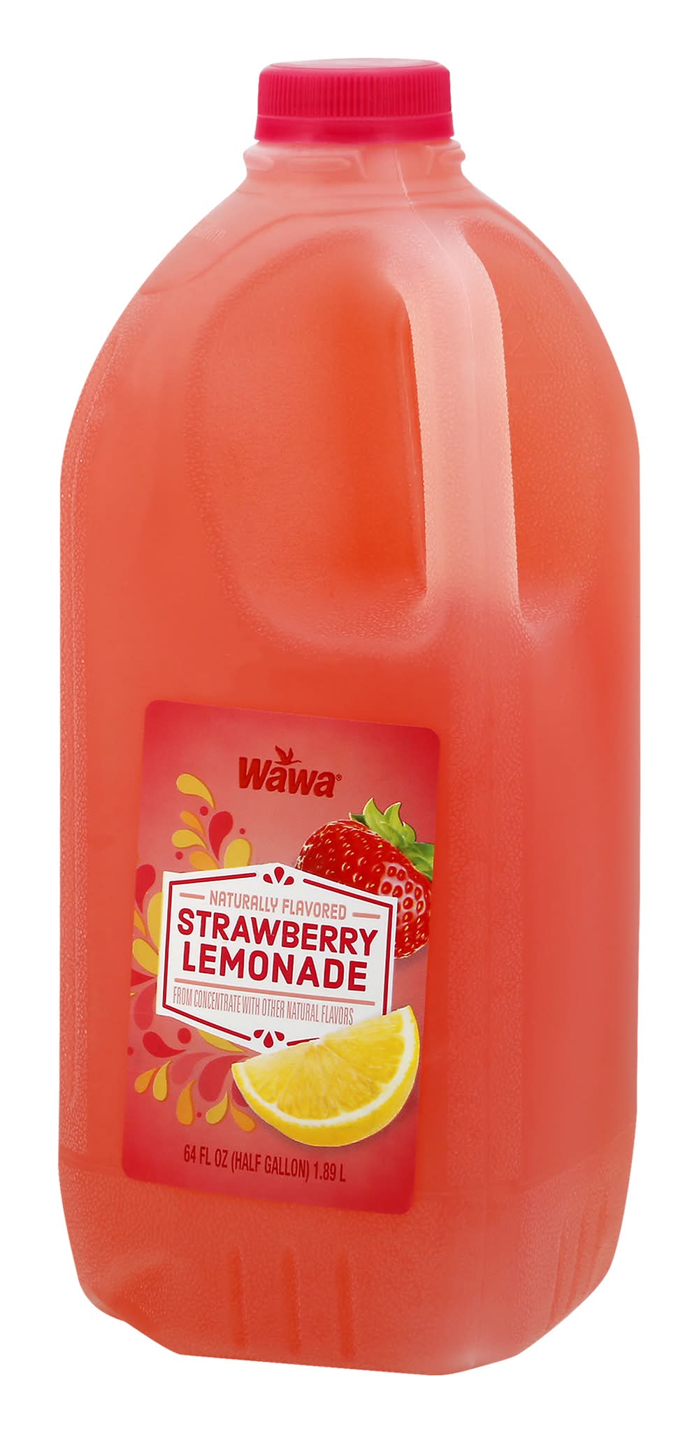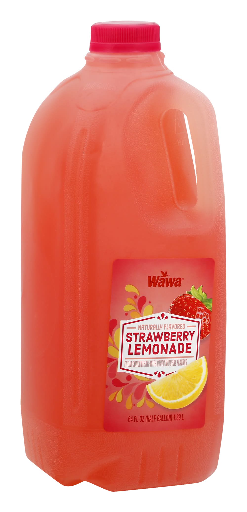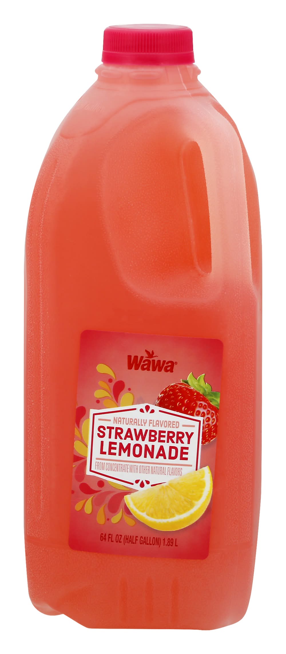 Naturally flavored. from concentrate with other natural flavors. Contains 10% juice. Pasteurized. • Brand: Wawa • Flavor: Strawberry lemonade • kosher • Packaging: Reusable