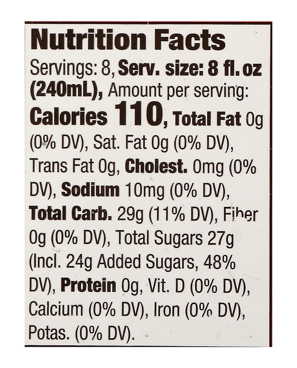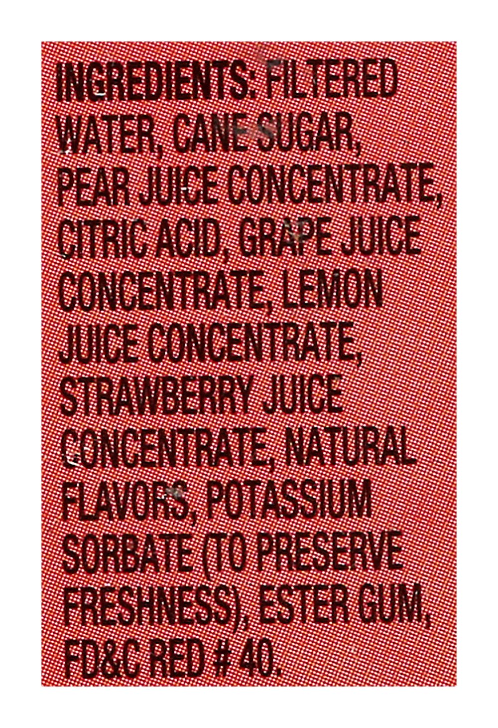Ingredients: Filtered Water, Cane Sugar, Pear Juice Concentrate, Citric Acid, Grape Juice Concentrate, Lemon Juice Concentrate, Strawberry Juice Concentrate, Natural Flavors, Potassium Sorbate (to Preserve Freshness), Ester Gum, FD&C Red 40