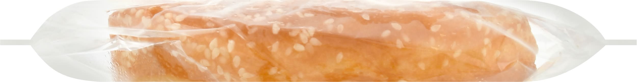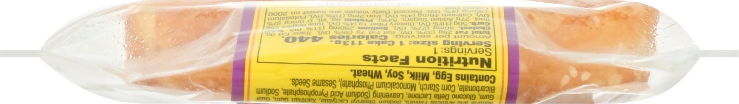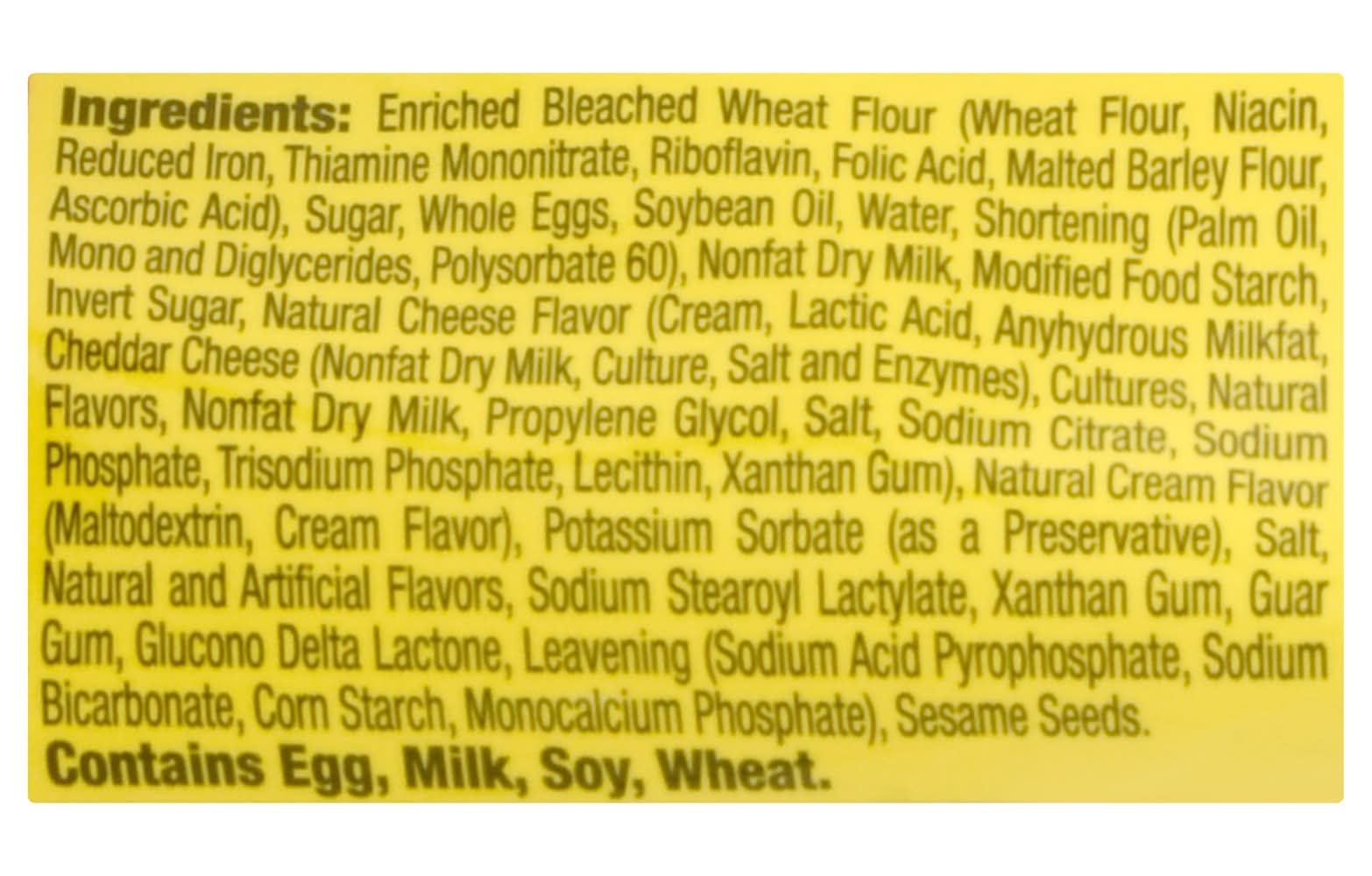 Ingredients: Enriched Bleached Wheat Flour (Wheat Flour, Niacin, Reduced Iron, Thiamine Mononitrate, Riboflavin, Folic Acid, Malted Barley Flour, Ascorbic Acid), Sugar, Whole Eggs, Soybean Oil, Water, Shortening (Palm Oil, Mono & Diglycerides, Polysorbate 60), Nonfat Dry Milk, Modified Food Starch, Invert Sugar, Natural Cheese Flavor (Cream, Lactic Acid, Anyhydrous Milkfat, Cheddar Cheese (Nonfat Dry Milk, Culture, Salt and Enzymes), Cultures, Natural Flavors, Nonfat Dry Milk, Propylene Glycol, Salt, Sodium Citrate, Sodium Phosphate, Trisodium Phosphate, Lecithin, Xanthan Gum), Natural Cream Flavor (Maltodextrin, Cream Flavor), Potassium Sorbate (as a Preservative), Salt, Natural and Artificial Flavors, Sodium Stearoyl Lactylate, Xanthan Gum, Guar Gum, Glucono Delta Lactone, Leavening (Sodium Acid Pyrophosphate, Sodium Bicarbonate, Corn Starch, Monocalcium Phosphate), Sesame Seeds Contains: Eggs, Milk, Soybeans, Wheat