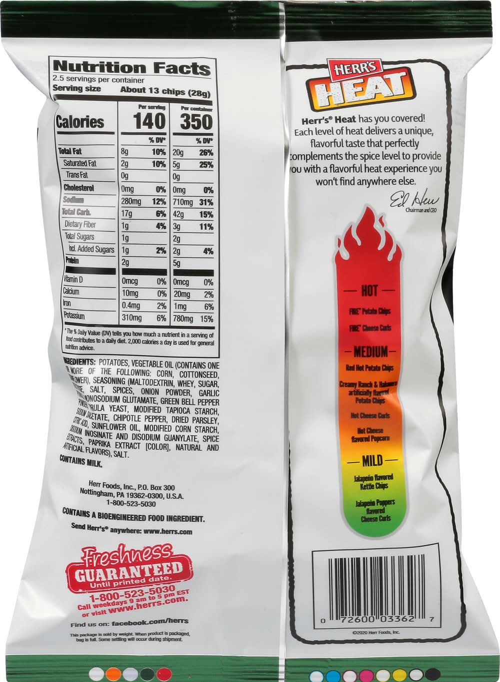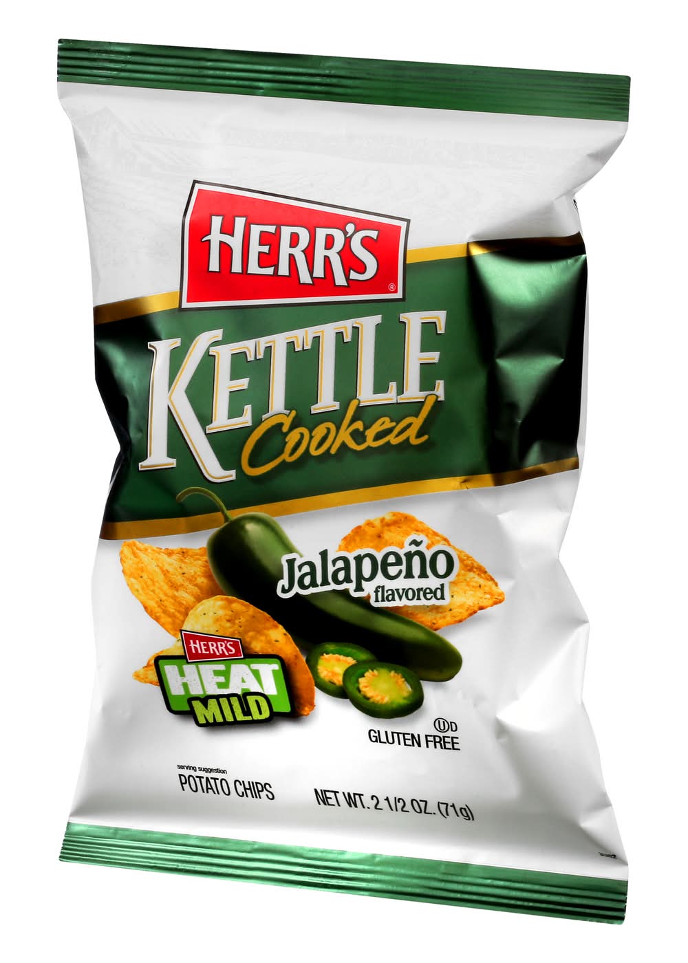 Crunch into a Herr's Kettle Cooked Potato Chip and you'll taste the difference! We start with a thicker cut of potato and slowly cook them one batch at a time for Herr's unique extra-hearty potato flavor. Speaking of flavor…Herr's Kettle Cooked Chips are seasoned with the freshest and zestiest flavor combinations. So, if you are looking for an authentic kettle potato chip experience, we invite you to enjoy the great taste of Herr's Kettle Cooked Potato Chips. Herr’s Kettle Cooked Potato Chips crispy texture, hearty taste and wide range of flavors make them the perfect snack to satisfy any craving or to bring with you for any occasion! So, whether you are out with friends or having a night in with the family, make sure you have Herr’s Kettle Cooked Potato Chips for all to enjoy. • Brand: Herr's • Flavor: Jalapeno • kosher, gluten-free • Herr Foods Inc., Nottingham, PA, 19362-0300