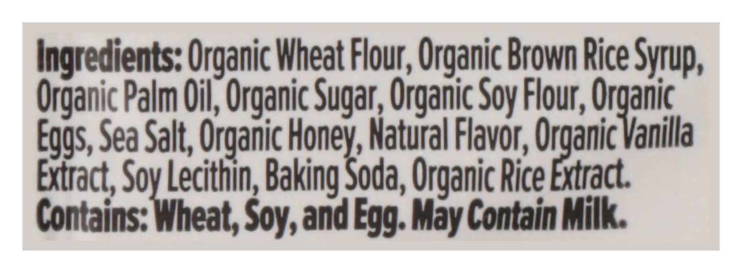 Ingredients: Organic Wheat Flour, Organic Brown Rice Syrup, Organic Palm Oil, Organic Sugar, Organic Soy Flour, Organic Eggs, Sea Salt, Organic Honey, Natural Flavor, Organic Vanilla Extract, Soy Lecithin, Baking Soda, Organic Rice Extract Contains: Wheat, Soybeans, Eggs, Milk