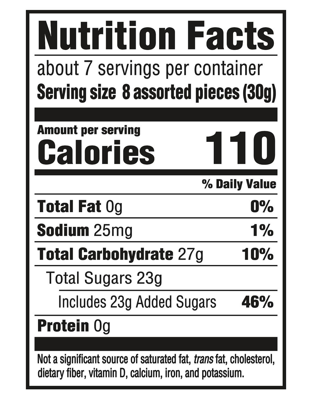 Ingredients: INGREDIENTS: SUGAR, INVERT SUGAR, CORN SYRUP, MODIFIED CORN STARCH, CONTAINS LESS THAN 2% OF CITRIC ACID, TARTARIC ACID, NATURAL AND ARTIFICIAL FLAVOR, TITANIUM DIOXIDE (FOR COLOR), RED 40, YELLOW 5, BLUE 1.