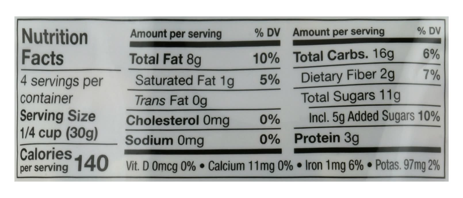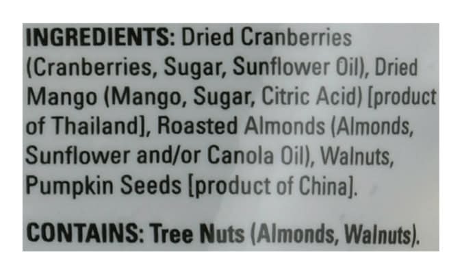 Ingredients: Dried Cranberries (Cranberries, Sugar, Sunflower Oil), Dried Mango (Mango, Sugar, Citric Acid), [Product of Thailand], Roasted Almonds (Almonds, Sunflower and/or Canola Oil), Walnuts, Pumpkin Seed [Product of China] Contains: Tree Nuts, Peanuts