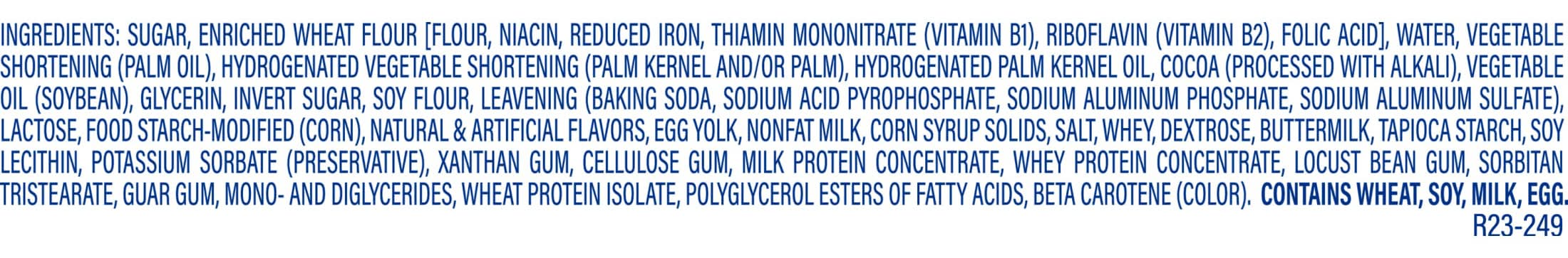 Ingredients: SUGAR, ENRICHED WHEAT FLOUR [FLOUR, NIACIN, REDUCED IRON, THIAMIN MONONITRATE (VITAMIN B1), RIBOFLAVIN (VITAMIN B2), FOLIC ACID], VEGETABLE SHORTENING (PALM OIL), WATER, HYDROGENATED PALM KERNEL OIL, COCOA (PROCESSED WITH ALKALI), VEGETABLE OIL (SOYBEAN), GLYCERIN, INVERT SUGAR, SOY FLOUR, LEAVENING [BAKING SODA, SODIUM ACID PYROPHOSPHATE, SODIUM ALUMINUM PHOSPHATE, MONOCALCIUM PHOSPHATE, ALUMINUM SULFATE], FOOD STARCH MODIFIED (CORN), NATURAL ARTIFICIAL FLAVORS, EGG YOLK, NONFAT MILK, CORN SYRUP SOLIDS, SALT, DEXTROSE, WHEY, BUTTERMILK, POTASSIUM SORBATE (PRESERVATIVE), XANTHAN GUM, CELLULOSE GUM, MILK PROTEIN CONCENTRATE, WHEY PROTEIN CONCENTRATE, CAROB BEAN GUM, TAPIOCA STARCH, GUAR GUM, SOY LECITHIN, MONO- AND DIGLYCERIDES, POLYGLYCEROL ESTERS OF FATTY ACIDS, WHEAT PROTEIN ISOLATE, BETA CAROTENE (COLOR), . Contains: CONTAINS EGG, MILK, SOY, WHEAT.