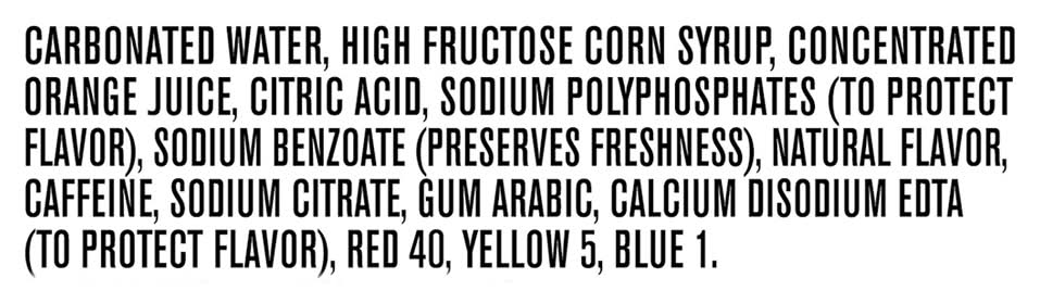 Ingredients: Carbonated Water, High Fructose Corn Syrup, Concentrated Orange Juice, Citric Acid, Sodium Polyphosphates (to Protect Flavor), Sodium Benzoate (Preserves Freshness), Natural Flavor, Caffeine, Sodium Citrate, Gum Arabic, Calcium Disodium EDTA (to Protect Flavor), Red 40, Yellow 5, Blue 1