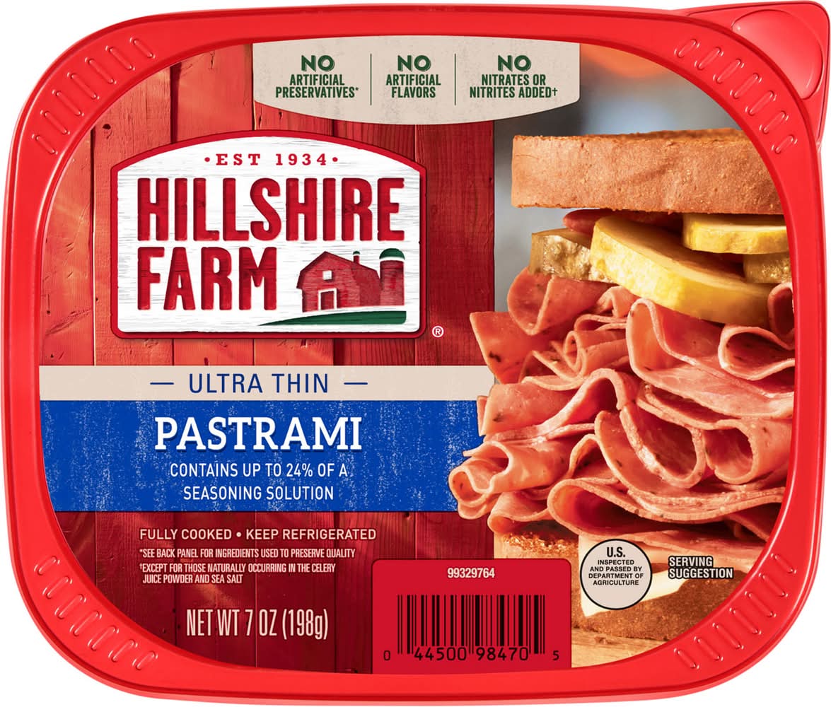 Can a sandwich crafted with delectably roasted cuts make your tastebuds quake with yearning? For Sure, It's Hillshire! Bring the goodness of the farm to your table and experience the taste of a homestyle sandwich made with Hillshire Farm Ultra Thin Sliced Pastrami Sandwich Meat. Made with perfectly seasoned, cured beef, our pastrami is juicy, flavorful and 95% fat-free. Our farmhouse quality pastrami is made with no artificial preservatives or flavors, and no nitrates or nitrites added (except for those naturally occurring in the celery juice powder and sea salt). Try our sliced pastrami in a sandwich or wrap, on a salad or as part of a charcuterie board. Each 7-ounce package of Hillshire Farm Pastrami is double sealed for freshness and flavor. At Hillshire Farm brand, we are committed to the values of the farm, and we know that quality is always the most important ingredient. You can taste the generations of care and craftsmanship in every recipe because farmhouse values never go out of season.
