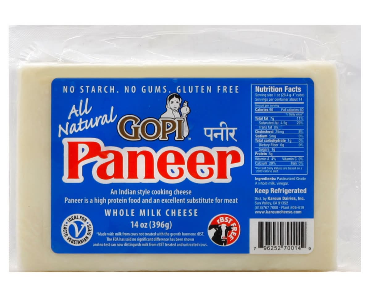 No starch. No gums. Gluten free. All natural. An Indian style cooking cheese. Paneer is a high protein food and an excellent substitute for meat. Ideal for lacto vegetarian diets. rBST free (Made with milk from cows not treated with the growth hormone rBST. The FDA has said no significant difference has been shown and no test can now distinguish milk from rBST treated and untreated cows). www.KarounCheese.com.