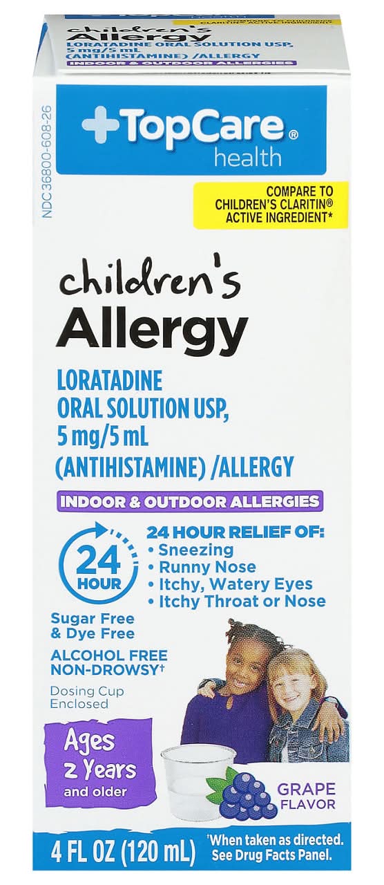 Ingredients: In Each 5 ml Teaspoonful: Active Ingredients: Loratadine (5 mg), Antihistamine. Inactive Ingredients: Edetate Disodium, Glycerin, Maltitol, Monobasic Sodium Phosphate, Natural and Artificial Grape Flavor, Phosphoric Acid, Propylene Glycol, Purified Water, Sodium Benzoate, Sorbitol, Sucralose.