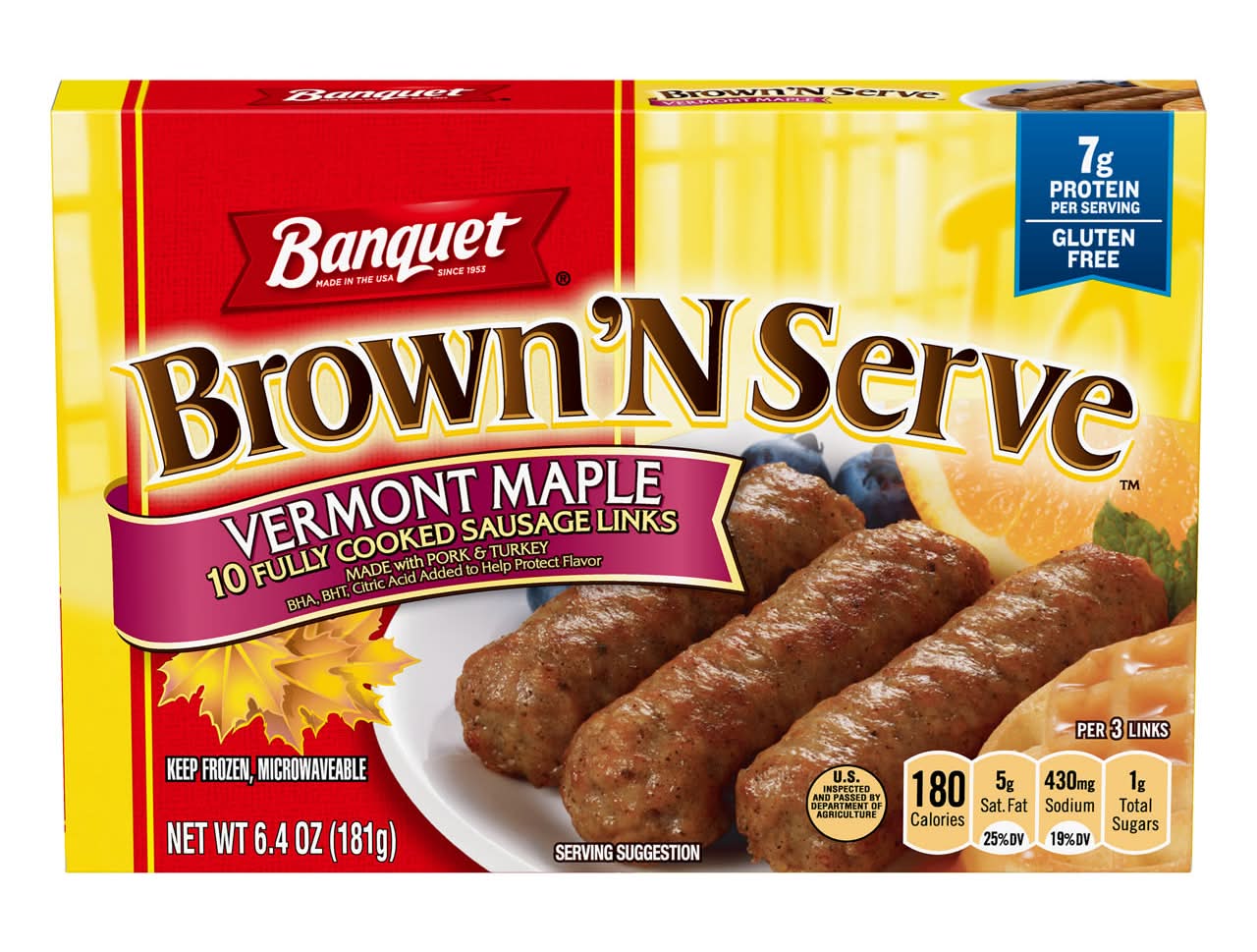 Banquet Brown ‘N Serve Vermont Maple Fully Cooked Sausage Links Frozen Meat is made with pork, turkey, and a special blend of spices and seasonings. Banquet Brown ‘N Serve Vermont Maple Sausage Links are gluten free and have 7 grams of protein per serving. With the commotion of getting ready for work and school, these breakfast sausages take away the headache of what to eat for breakfast on a hectic morning. Prepare the frozen sausages in a skillet in 7 minutes or in a microwave in 1 to 2 minutes; let stand for 1 minute. Keep sausage frozen. • Flavor: Vermont maple • Packaging: Reusable