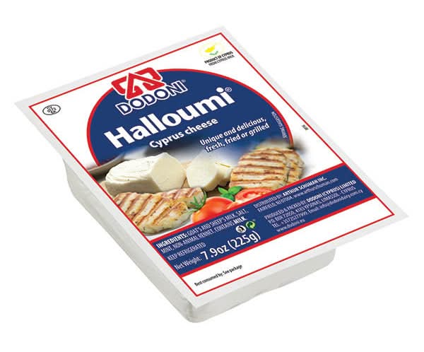 Halloumi Cheese is an imported cheese originating in the Mediterranean Island of Cyprus. It is made with cow, sheep, and goat milk and has a soft texture, with a deep savory aroma and a hint of mint. Halloumi has a high melting point which makes it perfect to grill, fry or bake.