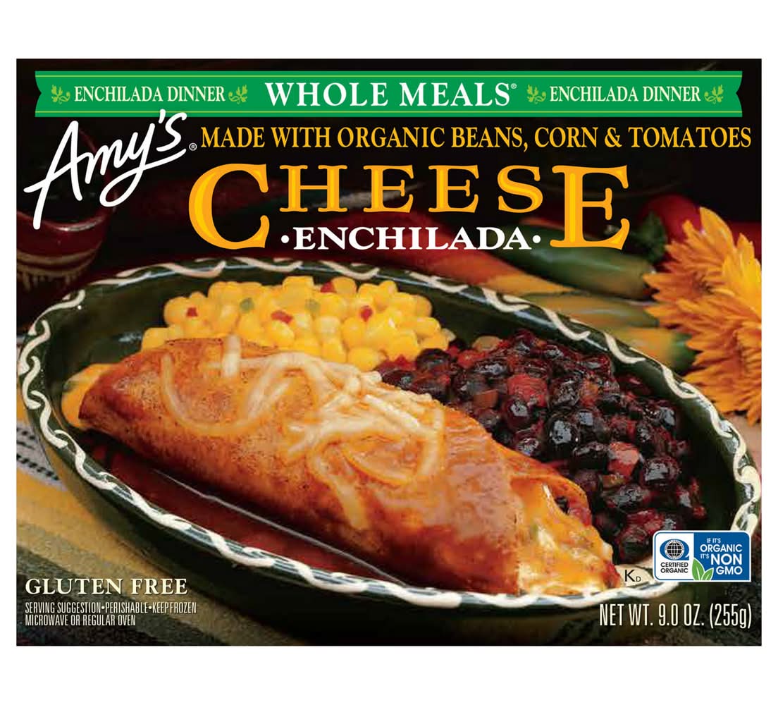 Microwave or regular oven. Our customers have been telling us for years, Your cheese enchilada tastes as good as any I've ever eaten, even in the best Mexican restaurant. So, to make a good thing even better, we've created a whole meal by adding organic golden corn accented with green chiles, black beans and salsa. Eat and enjoy! Family owned since 1987. After the birth of our daughter Amy in 1987, we found there was little time to prepare the quality homemade food we normally ate. Realizing there were others like ourselves, we started Amy's Kitchen to prepare delicious meals for those who care about the food they eat but are often too busy to cook. We use only the finest ingredients and prepare them with the same careful attention in our kitchen as you would in your own home. No meat, fish, shellfish, poultry, eggs or peanuts are ever used in any Amy's products. • Flavor: Cheese • Packaging: Reusable
