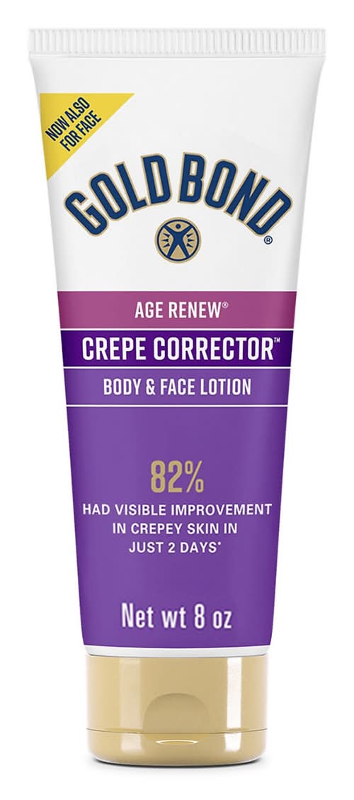 As we age, skin can lose its ability to retain moisture. The result is skin that looks finely wrinkled, thin and dry, like crepe paper. That's why there's Gold Bond Age Renew Crepe Corrector Body Lotion, which was voted the 2022 Product of the Year in the skin care category.** Formulated with seven moisturizers and three vitamins, this lotion for crepey skin is clinically shown to improve skin firmness and elasticity in two weeks. In fact, 82% had visible improvement in crepey skin on back of hands and arms in just two days. The replenishing formula features a unique smoothing concentrate made with nourishing omega-fatty acids, powerful botanicals and protective anti-oxidants. It also provides lasting hydration for 24 hours to help visibly firm and plump dry, aging skin. Gold Bond Crepe Corrector Lotion is suitable for all skin types. Best of all, it's hypoallergenic, fragrance-free and dermatologist tested. Enjoy skin as young as you feel in just two days* with Gold Bond Age Defense Crepe Corrector lotion.*Refers to improvement in crepey skin**Based on a survery of 40,000 American shoppers by Kantar
