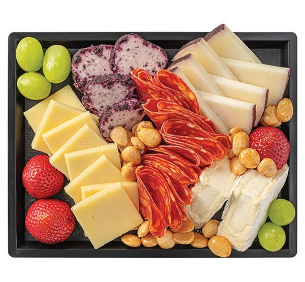 Ingredients: Keep Refrigerated. - - MADE WITH NO GLUTEN-CONTAINING INGREDIENTS. - - Ingredients: Drunken Goat (Pasteurized Goat's Milk, Salt, Animal Rennet, Cheese Cultures. Rind bathed in Monastrell Wine), 12 Month White Cheddar (Pasteurized Cow's Milk, Cheese Culture, Salt, Microbial Enzymes), Professor's Brie (Pasteurized Cow's & Sheep's Milk, Pasteurized Cream, Cheese Cultures, Salt, Microbial Rennet), OR Mild Brie (Pasteurized Cow's Milk, Cream, Cheese Cultures, Salt, Microbial Enzymes), OR Bon Vivant (Pasteurized Cow's Milk, Cream, Cheese Cultures, Salt, Microbial Enzymes, Annatto [color]), Blueberry Vanilla Goat (Pasteurized Goat's Milk, Blueberries [Blueberries, Cane Sugar, Sunflower Oil], Cane Sugar, Salt, Vanilla Extract, Cheese Cultures [Milk], Microbial Enzymes), Strawberries, Wegmans Hot Salami (Pork, Salt, Red Wine, Contains 2% or less of each: Spices, Natural Flavors, Lactic Acid Starter Culture), OR Wegmans Mild Salami (Pork, Salt, Spices, Garlic, Contains 2% or less of each: Natural Flavors, Lactic Acid Starter Culture), Marcona Almonds (Marcona Almonds, Sunflower Oil, Sea Salt), Grapes OR Blackberries.
