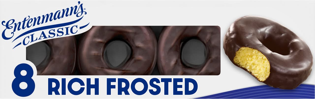 Indulge in the delightful taste of Entenmann's Classic Rich Frosted Donuts, 8 count, 16.5 oz. These rich, fluffy donuts are lovingly frosted to perfection, making them a sweet treat that kids and adults alike will adore. Perfectly paired with your morning coffee or enjoyed as an afternoon snack, these donuts bring a harmonious blend of flavors to your day. Each donut is crafted to be Kosher (OU Dairy), ensuring that you can share the delight with everyone. Whether you crave a classic crumb donut or a luscious chocolate doughnut, these Entenmann's Classic Rich Frosted Donuts, 8 count, 16.5 oz are sure to refresh your spirit. Discover the joy of sharing and connecting over these irresistible treats, making every moment sweeter. • Flavor: Chocolate • Packaging: Reusable