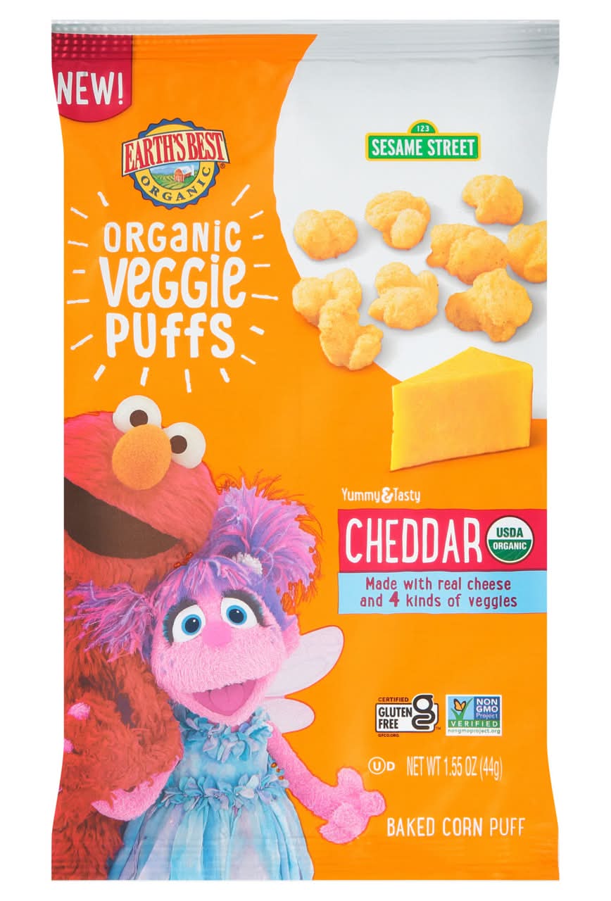 Toddler USDA Organic. www.earthsbest.com; www.sesamestreet.org 800-434-4246 Earth's Best Organic Cheddar Puffs are made with organic ingredients grown from the earth--no artificial flavors or potentially harmful pesticides added. These delicious puffs are made using real cheddar cheese and organic grown corn, cauliflower, carrots, onions, and garlic. Cheddar puffs are deliciously simple and airy snacks that kids will love to munch on. Flavor: Cheddar