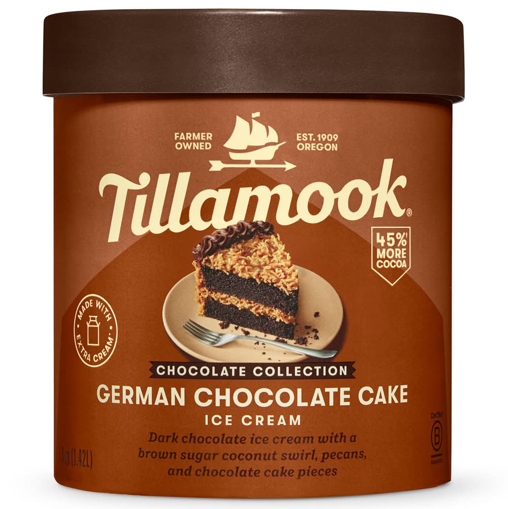 Treat yourself to chocolate decadence with new Tillamook Chocolate Collection German Chocolate Cake Ice Cream, made with extra cream and 45% more cocoa for rich spoonfuls. With a brown sugar coconut swirl, pecans and chocolate cake pieces, this smooth and creamy dark chocolate ice cream is one you won't forget. Made with more cream than required and less air, Tillamook Ice Cream is creamy, smooth and rich for delicious spoonfuls. Enjoy it scooped in a bowl or in homemade ice cream sundaes, chocolate ice cream sandwiches or chocolate ice cream cones. A perfect complement to brownies, cookies, cakes and desserts, this is an easy party food that is sure to be a crowd-pleaser. Or use your creativity and whip up unique frozen desserts, like a custom chocolate ice cream cake, to make your gatherings and celebrations unforgettable. Our take on a classic cake, this premium ice cream is rich in flavor because it's made right. Tillamook Ice Cream uses high-quality milk from cows not treated with rBST*, cage-free eggs and no artificial flavors or artificial preservatives. Better yet, you can be assured that each purchase you make helps support Tillamook County Creamery Association in their pursuit to do right. As a Certified B Corp, Tillamook County Creamery Association is committed to being good stewards of cows and farms, of people and products, their communities and the environment. With over 110 years of quality dairy experience backing it, this extra creamy Tillamook Ice Cream has a taste to remember. Do Right By Every Bite. *The FDA has stated that no significant difference has been shown between milk derived from rBST treated and non-rBST treated cows. Flavor: German chocolate cake