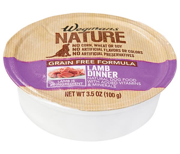 Grain Free Formula. Lamb is the #1 Ingredient. With Added Vitamins & Minerals. No corn, wheat or soy. No artificial flavors or colors. No artificial preservatives. GUARANTEED ANALYSIS: Crude Protein (min) 8.5%, Crude Fat (min) 8.0%, Crude Fiber (max) 1.5%, Moisture (max) 78.0%. Wegmans Nature Lamb Dinner dog food is formulated to meet the nutritional levels established by the AAFCO dog food nutrient profiles for growth and maintenance except for growth of large size dogs (70 lb. or more as an adult). Calorie Content (ME Calculated): 1,517 KCAL/KG, 152 KCAL/CAN.