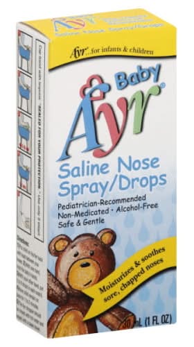 Infants: put child on his/her back with head between your knees. gently remove excess mucus with warm, moist cloth or cotton swab. with one hand, hold the baby's hands. with your other hand, put 2 to 6 drops in each nostril, taking care not to touch the dropper tip to hands, nose, or nasal secretions. have child remain on back for 1 to 2 minutes. gently wipe the nose with tissue or use a nasal aspirator or bulb syringe. the ayr dropper tip should be rinsed with hot water and wiped with a clean towel. do not use the same bottle for other children. use as often as needed. older children: hold bottle upright, give short, firm squeezes into each nostril. take care not to aspirate nasal contents back into bottle. use as often as needed. 1) put child on his/her back with head between your knees. 2) with one hand, hold the baby's hands. 3) with your other hand, put 2 to 6 drops in each nostril. 4) have child remain on back for 1 to 2 minutes. 5) the ayr dropper should be rinsed with hot water and wiped with a clean towel.