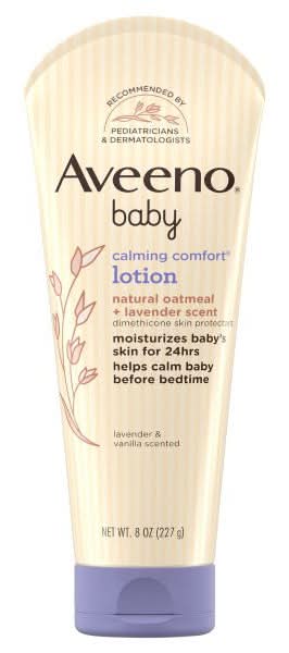 Recommended by pediatricians & dermatologists. Natural oatmeal + lavender scent. Dimethicone skin protectant. Moisturizes baby's skin for 24 hrs helps calm baby before bedtime. We use high quality, natural oats, and carefully harvest their protective, moisturizing and soothing properties. Natural Oatmeal: Finely-milled and locks in moisture. Lavender Scent: Known for its calming properties. Fast-absorbing formula clinically proven to moisture for 24 hours. pH-balanced. Non-greasy. Free of parabens, phthalates, phenoxyethanol, steroids. Aveeno is a pediatrician and dermatologist recommended brand. Helps relax baby before bed. No 1 recommended brand (In the combined infant cleansing and baby lotion categories in the US). Formulated with: Lavender scent. Natural colloidal oatmeal. Dimethicone skin protectant. Helps protect & moisturize baby's skin for 24 hours. Using during massage, which is clinically shown to aid in baby's healthy development. For daily use on: Normal and delicate skin, and to help calm baby before bed. www.aveeno.com. how2recycle.info. Questions? 866-428-3366; Outside US, dial collect 215-273-8755 www.aveeno.com. Other information: To open, twist off cap, and remove quality seal. Do not use if quality seal is broken. Store at room temperature. Packaging: Reusable