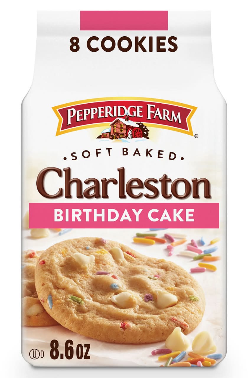 These delicious Pepperidge Farm Charleston Birthday Cake Cookies are baked with rich, white chocolate chips and colorful sprinkles, and the result is simply delicious. Satisfy your most decadent cookie cravings with soft and sweet cookies that are perfect for a midday treat or to serve at your next get-together or celebration. With 8 Pepperidge Farm Charleston Birthday Cake Soft Baked Cookies per bag, there’s always enough to share. And what better way to celebrate than with a cookie! For Pepperidge Farm, baking is more than a job. It's a real passion. Each day, our bakers take the time to make every cookie, pastry, cracker, and loaf of bread the best way they know how – by using carefully selected, quality ingredients. With comforting goodness baked into everything we do, you’ll want to have Pepperidge Farm Charleston Cookies on hand and ready to serve. • Flavor: Birthday cake • Packaging: Reusable