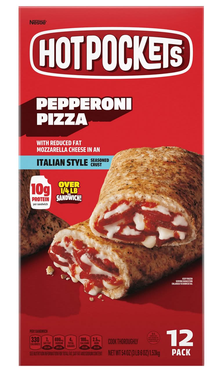 Hot Pockets Pepperoni Pizza frozen snacks are filled with premium pepperoni and reduced-fat mozzarella cheese inside an Italian-style seasoned crust. Each sandwich provides 10 grams of protein and can be cooked in the microwave for 1 minute 50 seconds or air-fried at 360 F for 16 minutes. Keep frozen until ready to cook. Flavor: Italian style