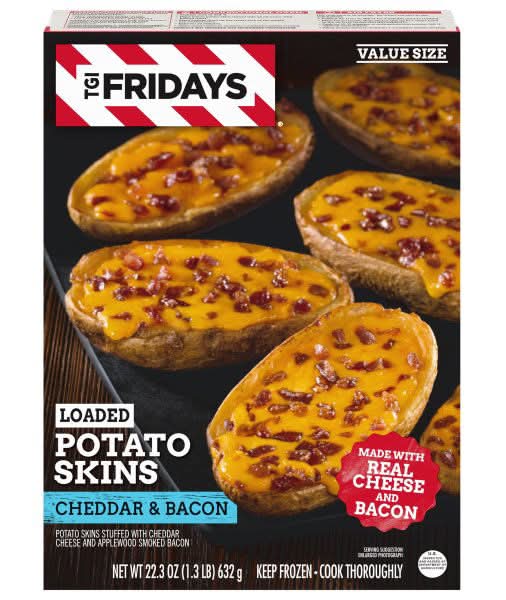Potato skins stuffed with cheddar cheese and applewood smoked bacon. U.S. inspected and passed by Department of Agriculture. www.fridaysinyourfreezer.com. how2recycle.info. Scan for more food information. Call 1-800-457-9810 for more food information. Questions or comments? Call 1-800-457-9810, Monday - Friday. Please have packaging available when calling. To learn more about T.G.I. Friday’s frozen snacks, visit www.fridaysinyourfreezer.com. • Flavor: Cheddar-bacon • Packaging: Reusable