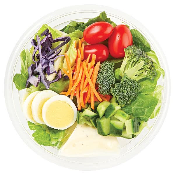 Fresh romaine with Broccoli, matchstick carrots, cucumber, grape tomatoes, hardboiled eggs, red cabbage, and Buttermilk Ranch Dressing.{{{NL}}}{{{NL}}}160 calories per serving. 2,000 calories a day is used for general nutrition advice, but calorie needs vary. Additional nutrition information available upon request by contacting Wegmans Food Markets, 1500 Brooks Avenue, Rochester, NY 14624, 1-800-WEGMANS, comments@wegmans.com.