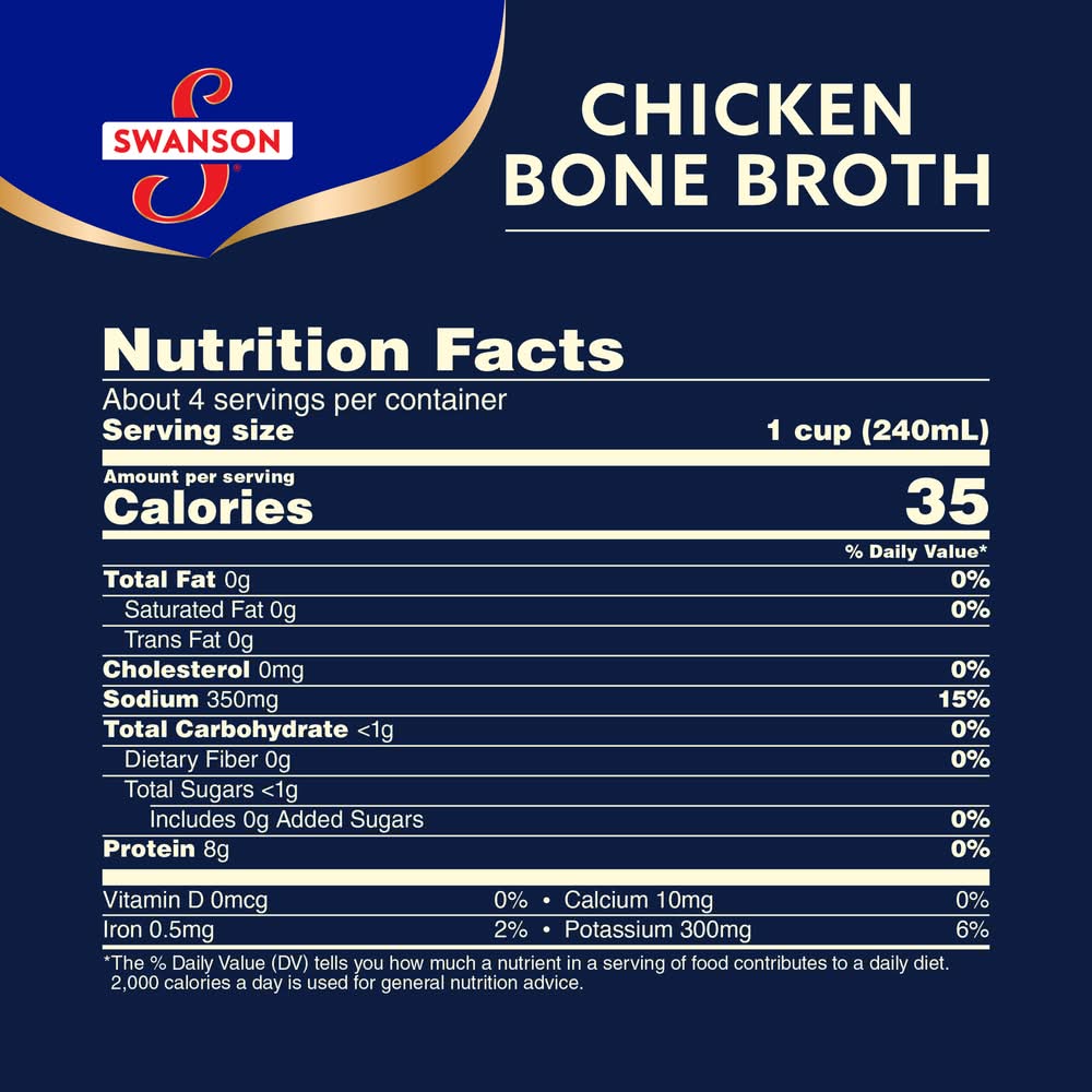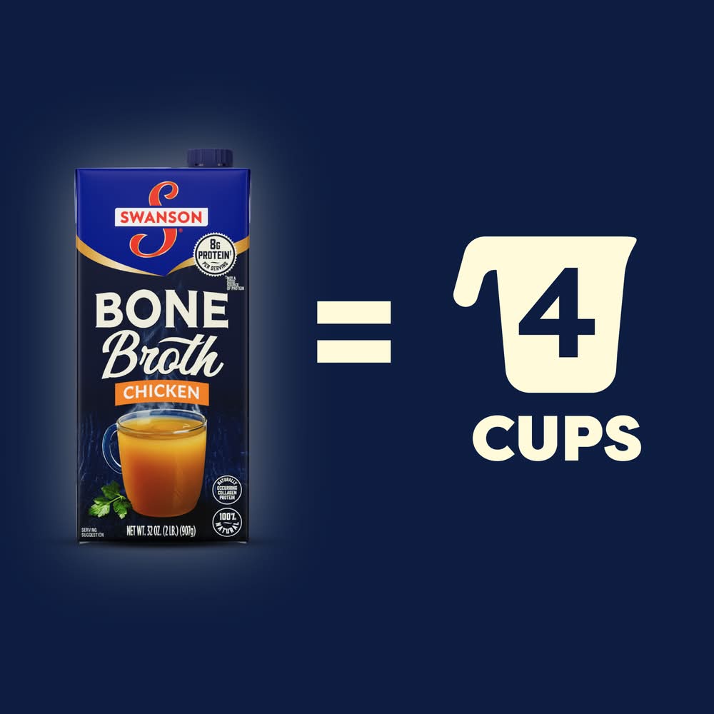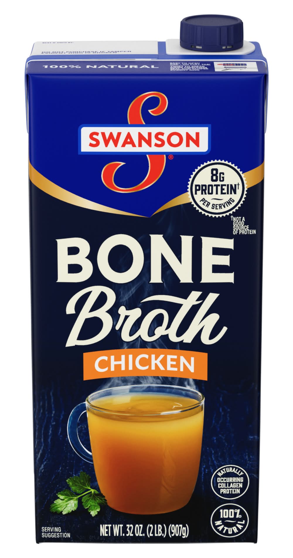 Experience nutritious cooking and savory sipping with Swanson Chicken Bone Broth. We simmer a mix of chicken stock, real bones, vegetables, herbs and spices to create a savory bone broth with rich, full-bodied flavor. Made with 100% natural, non-GMO ingredients, Swanson bone broth is a simple yet flavorful way to add collagen protein to your diet. Each 1-cup serving contains 8 grams of protein and 35 calories. Drink a warm cup of Swanson bone broth instead of coffee or tea, or try it as a nutritious alternative to regular chicken soup. For an even better sipping experience, add a slice of lemon and some fresh rosemary. In addition to drinking it as a sipping broth, you can use this bone broth in any recipe that calls for chicken broth. It’s great as a soup base, and it can be used instead of water to boost rich flavor in rice, pasta and veggies. Swanson broth is a must-have for your holiday cooking, bringing richer, elevated homemade flavor to mashed potatoes, stuffing and more. It’s not just any broth. It’s Swanson. • Campbell soup company, Camden,NJ, U.S.A. • Packaging: Reusable
